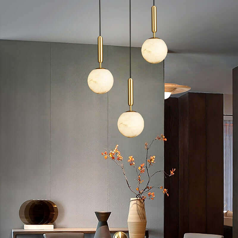 The Bosso Pendant Lamp combines modern style with timeless elegance. Featuring a 4.7" snowflake alabaster sphere and brass accents, it casts a soft, ambient glow. Perfect for illuminating spaces like over counters, dining tables, or bedsides, this small hanging lamp adds sophistication to any room.
