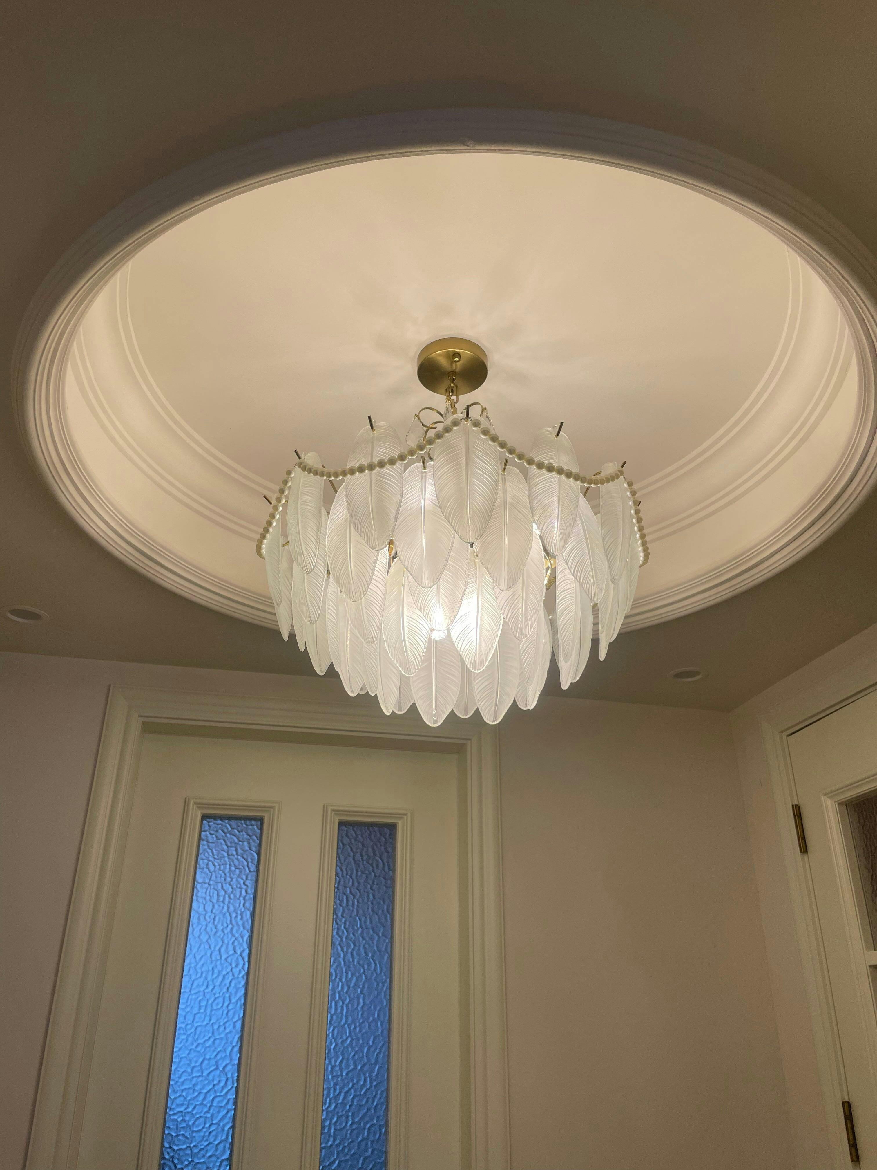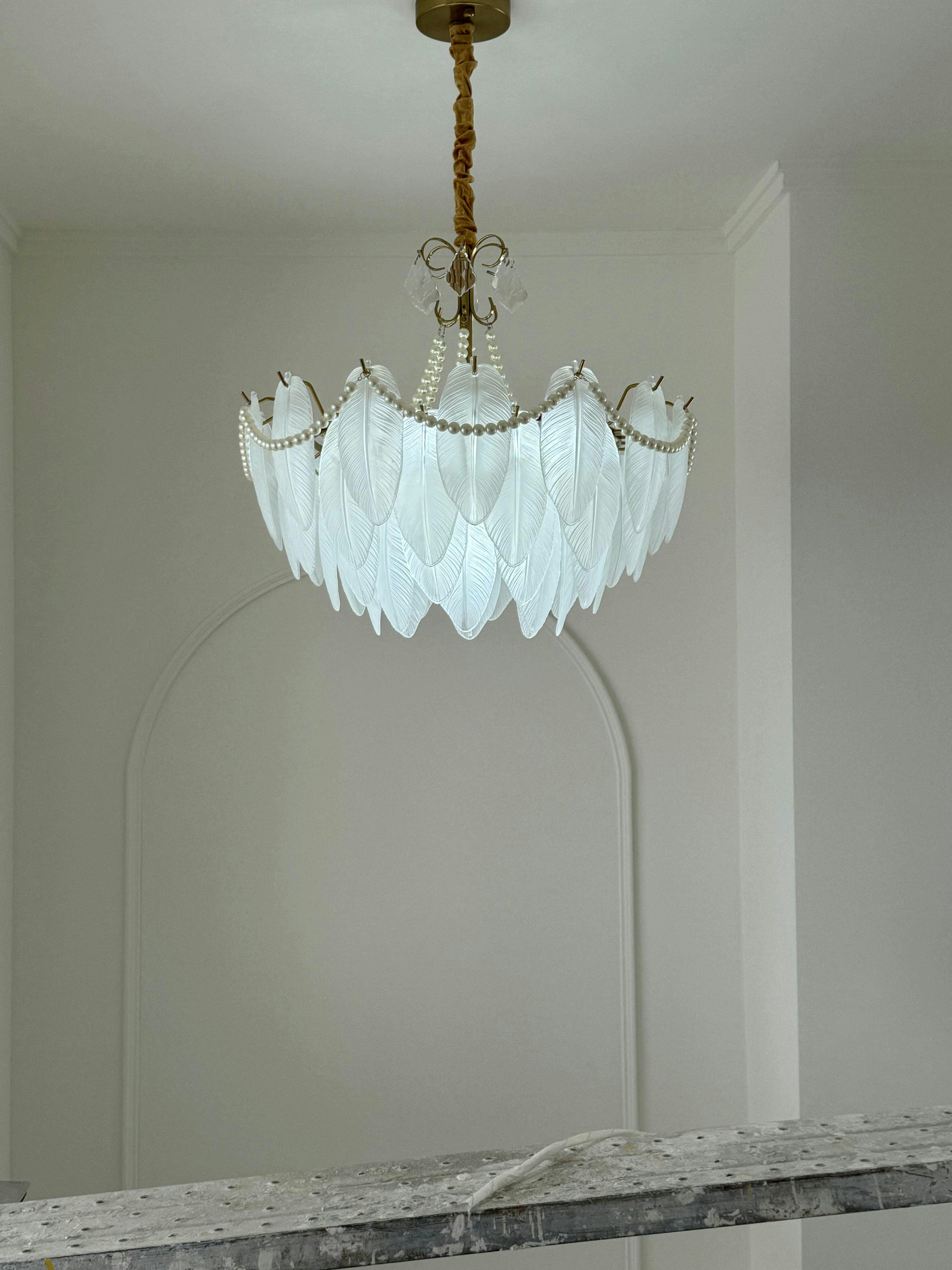 Turn heads with the Peroleno Chandelier โ€” a refined fusion of vintage pearl strands, golden brass, and frosted feathered glass. This modern centerpiece glows with elegance, perfect for elevating your living room, bedroom, or dining area with timeless mid-century sophistication.