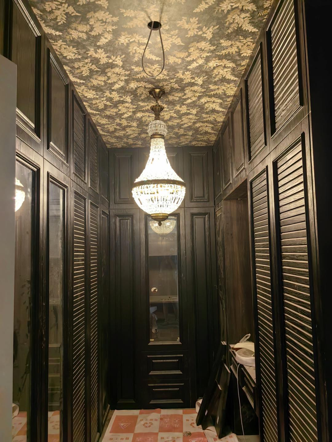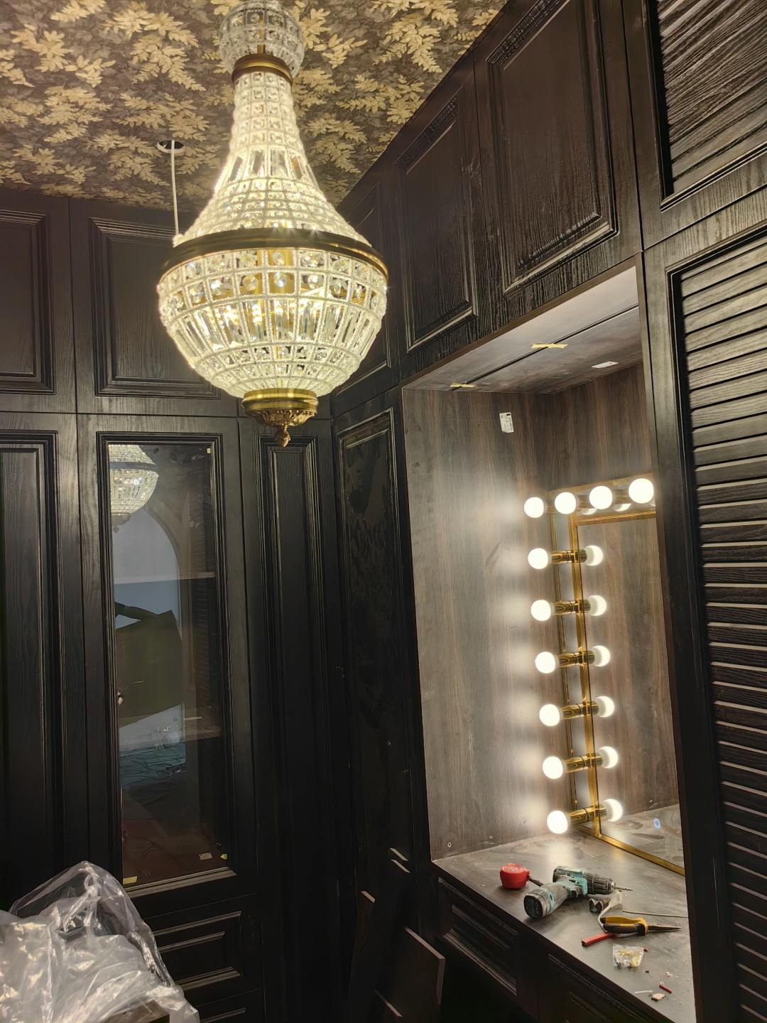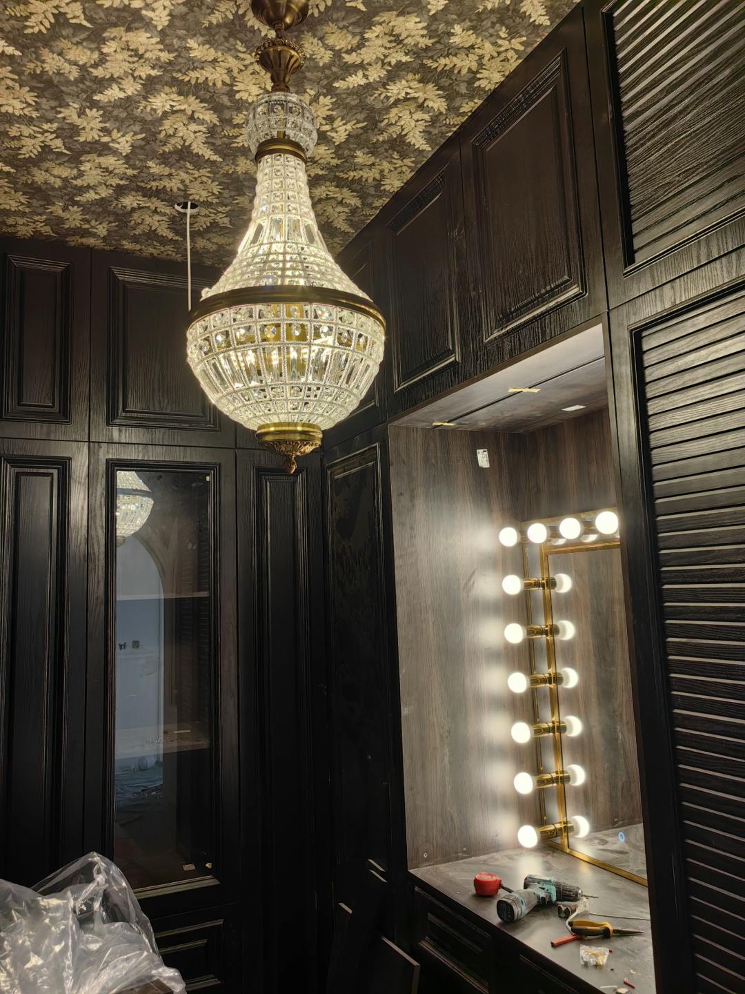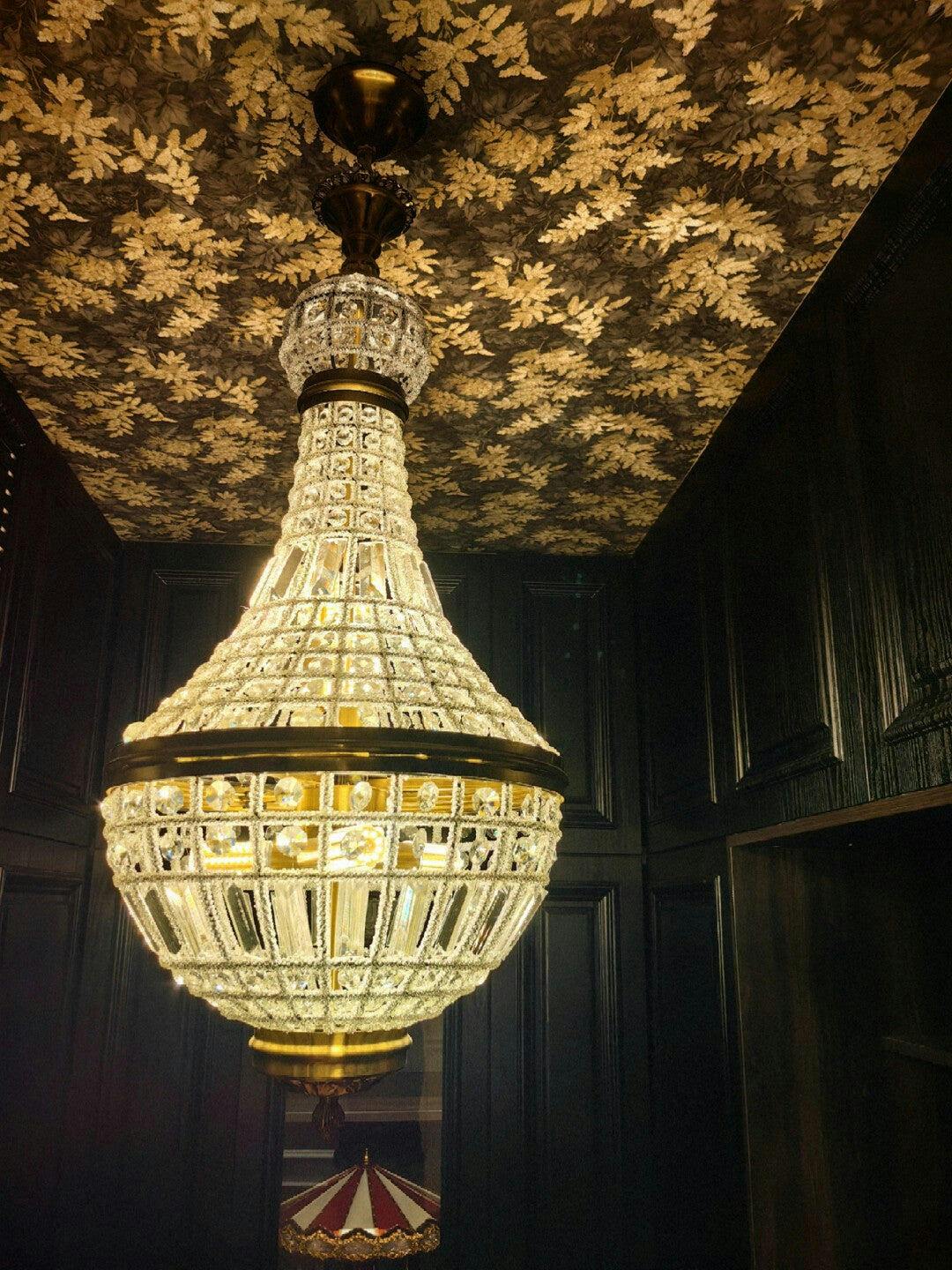 The chandelier is adorned with intricate crystal patterns that sparkle beautifully, creating a dazzling atmosphere in your space.