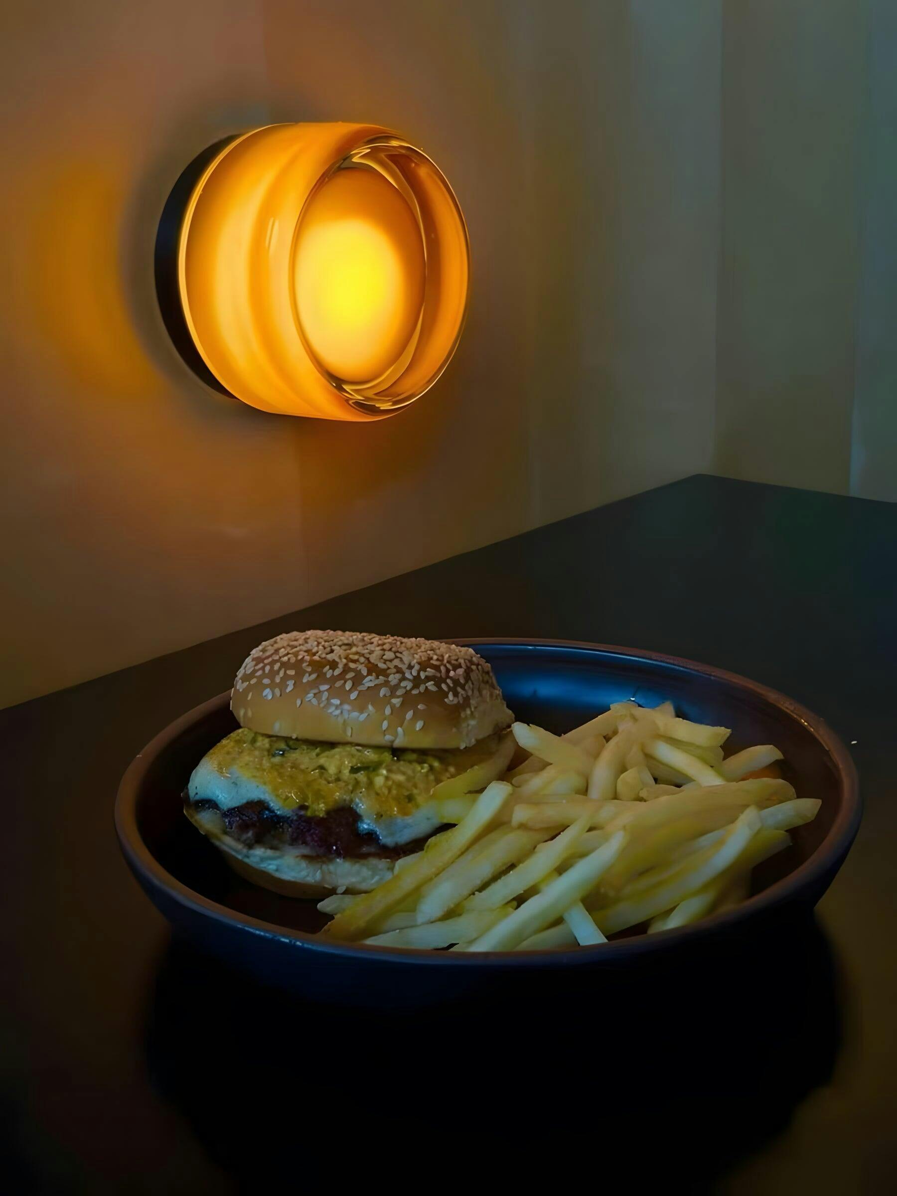 Dimple wall sconce, vintage design, round shape, perfect for hallways, soft ambient lighting.