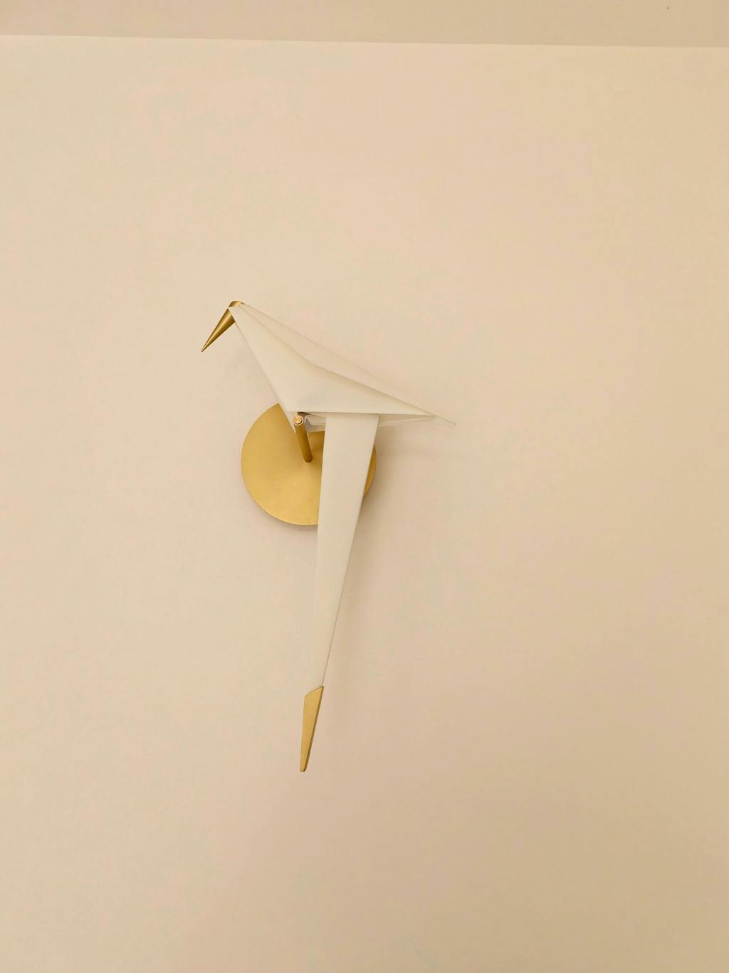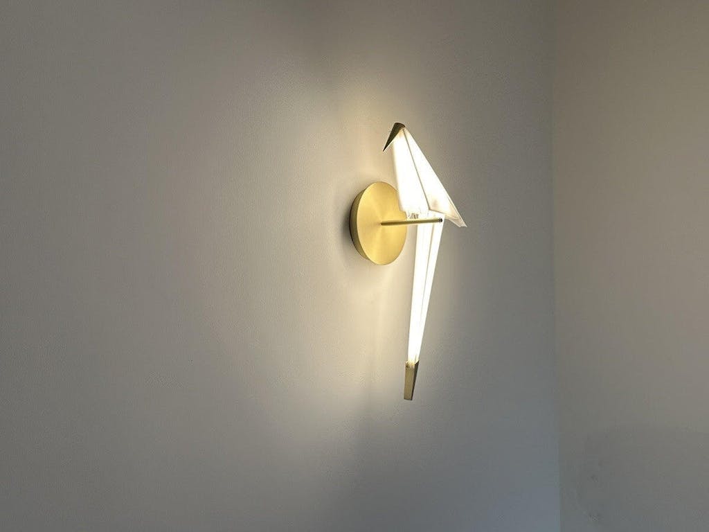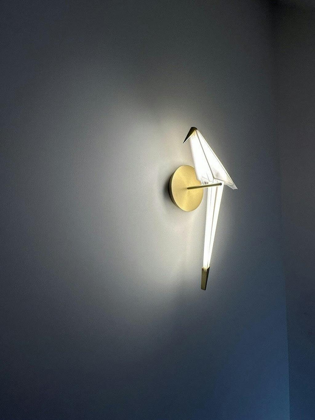 White paper crane wall lamp mounted on a patterned wall, perfect for art deco sconces and farmhouse decor.