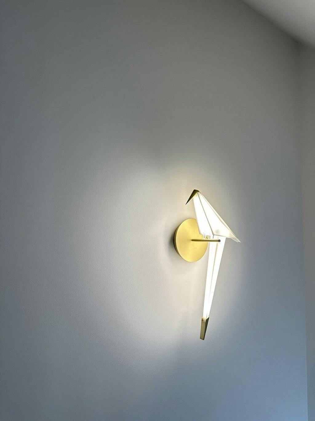 Art Deco White Paper Crane Wall Lamp, a unique bird wall sconce perfect for living room and farmhouse styles.