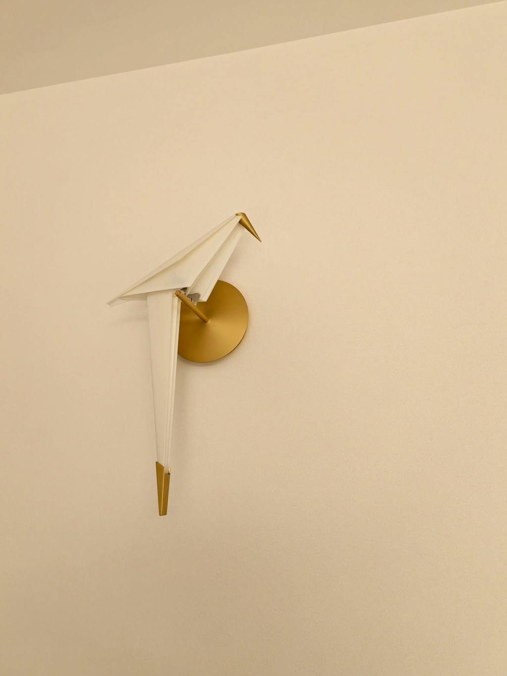 Experience the Zunqia Wall Lamp—a harmonious blend of art and illumination. Rising from its rich, golden base, the simple yet elegant structure leads to the delicate form of an origami-inspired paper crane shade. Casting warm, diffused light, it creates an atmosphere of peaceful serenity in any setting.