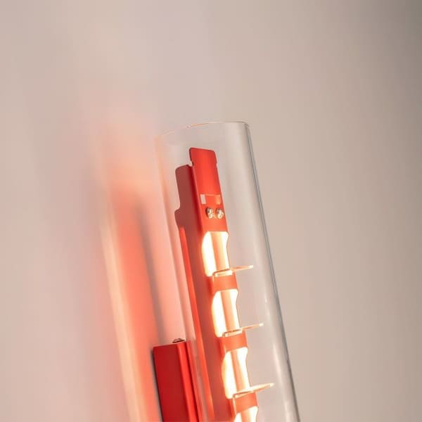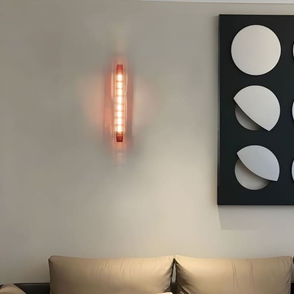 Bring sculptural light to your walls with the Zafurea Wall Sconce. Featuring a sleek cylindrical glass shade and radiant red metal core, it casts a warm ambient glow that transforms your dining room, bedroom, or hallway. Perfect as a bedside sconce or modern accent in any space, this piece is art and function in one.