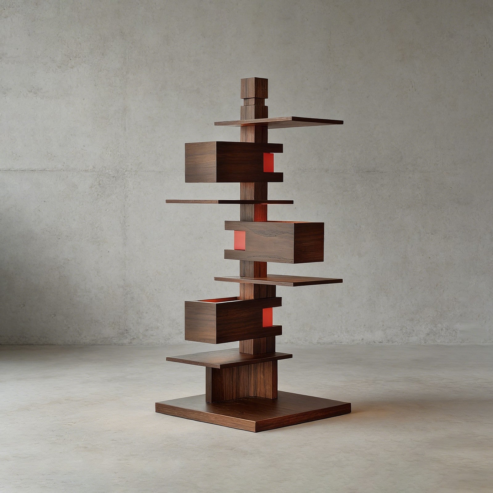 Taliesin wood table lamp design with art deco style, featuring layered wooden shapes and a splash of red accent.