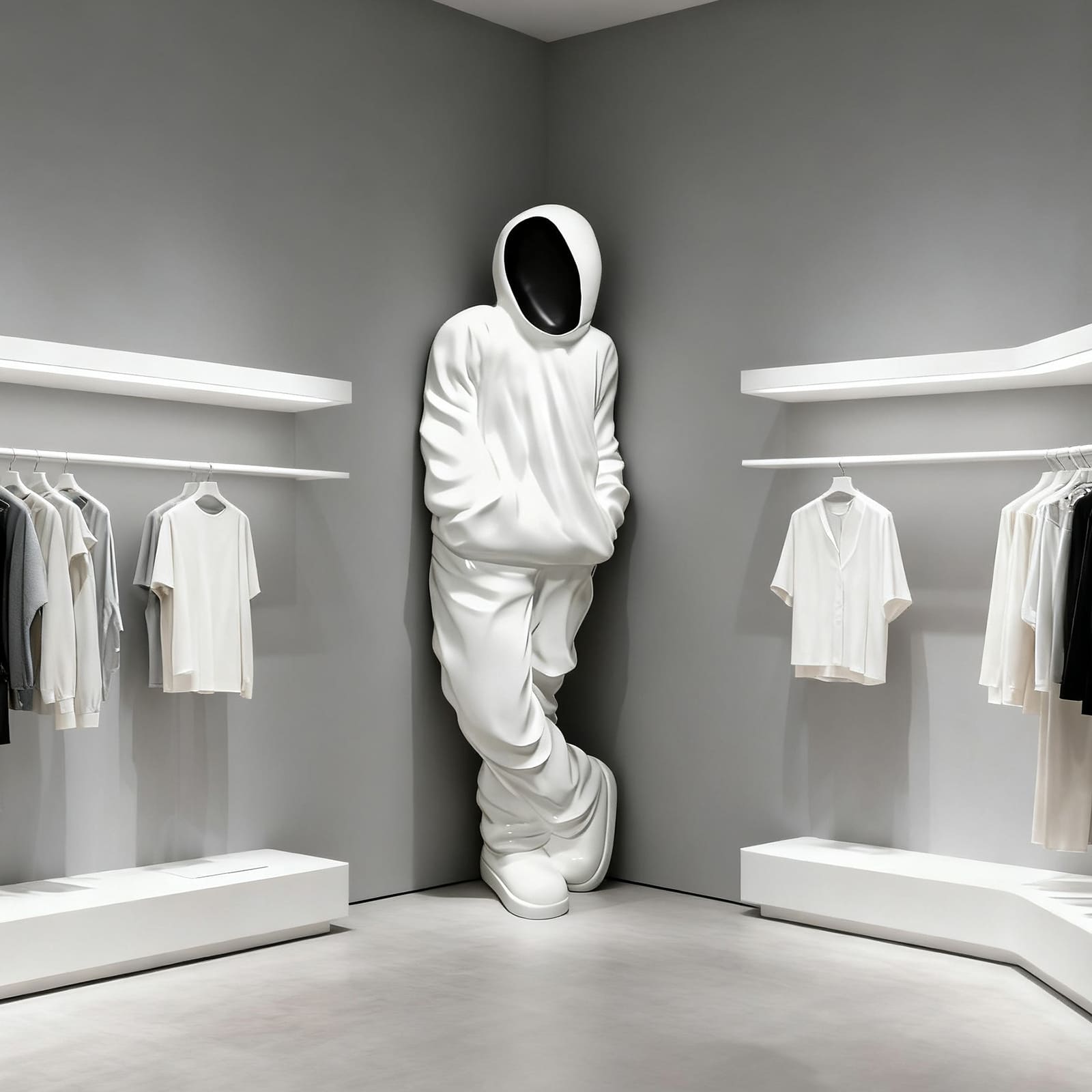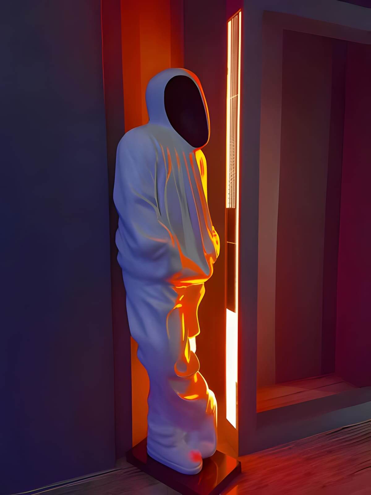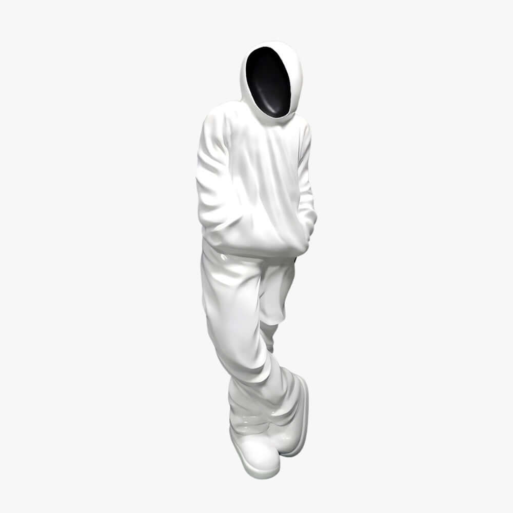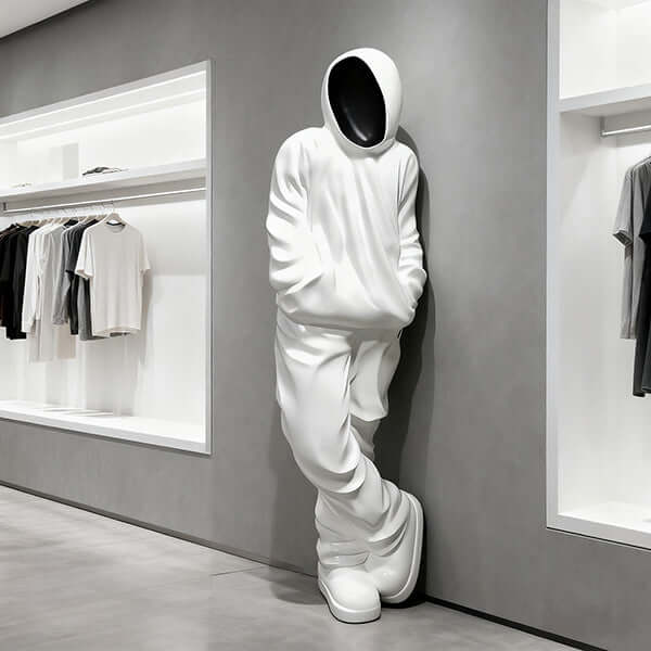 The laid-back hoodie design and relaxed posture capture a bold streetwear vibe, perfect for modern interiors.