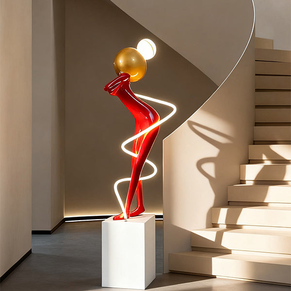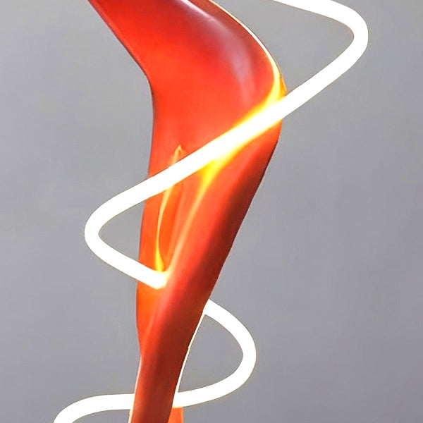 This floor lamp features bold curves and a vibrant red finish, making it a stunning piece of art in any room.