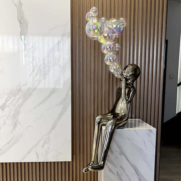 The transparent, iridescent bubbles catch light beautifully, creating a magical, floating illusion.