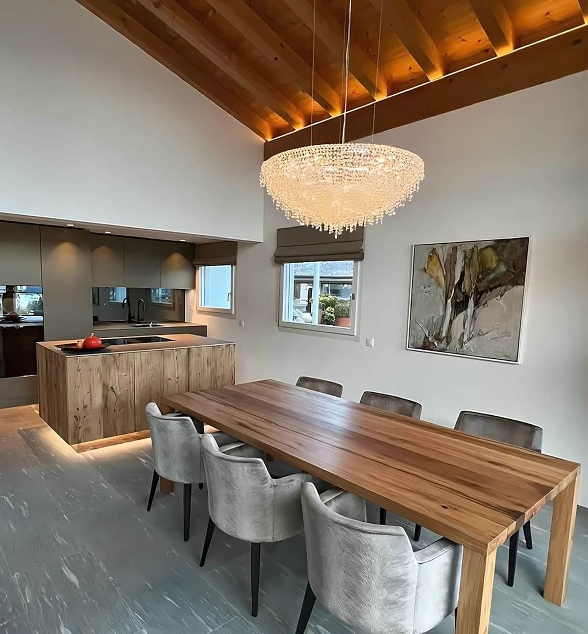 The Jovira Crystal Chandelier blends modern design with luxury. Its semicircular shape and creative crystal details create a dazzling light display, adding sophistication to any room. Whether in a lobby or living room, this chandelier is the perfect focal point for a stylish and welcoming space.