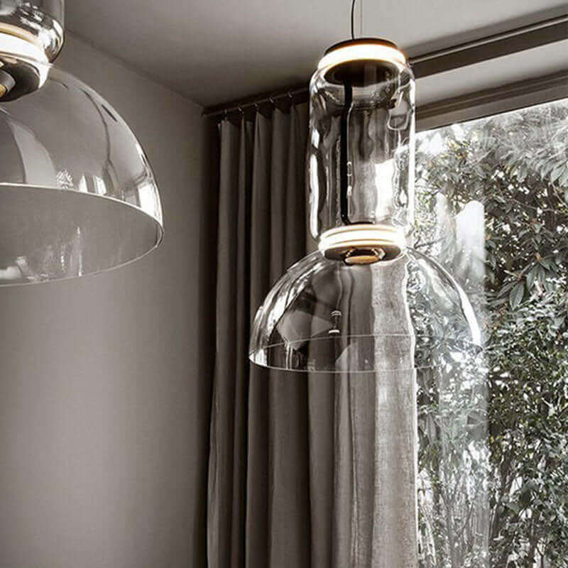 The Noctilucous Pendant Light works as both a hanging or standing lamp. Its clear body blends in by day, then glows beautifully at night. Choose a dome or cone top to customize your look and direct light just how you like it—sleek, modern, and effortlessly versatile.