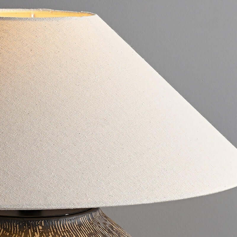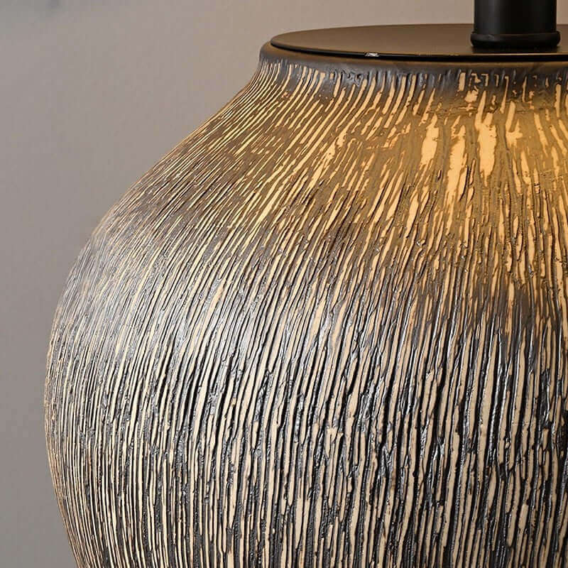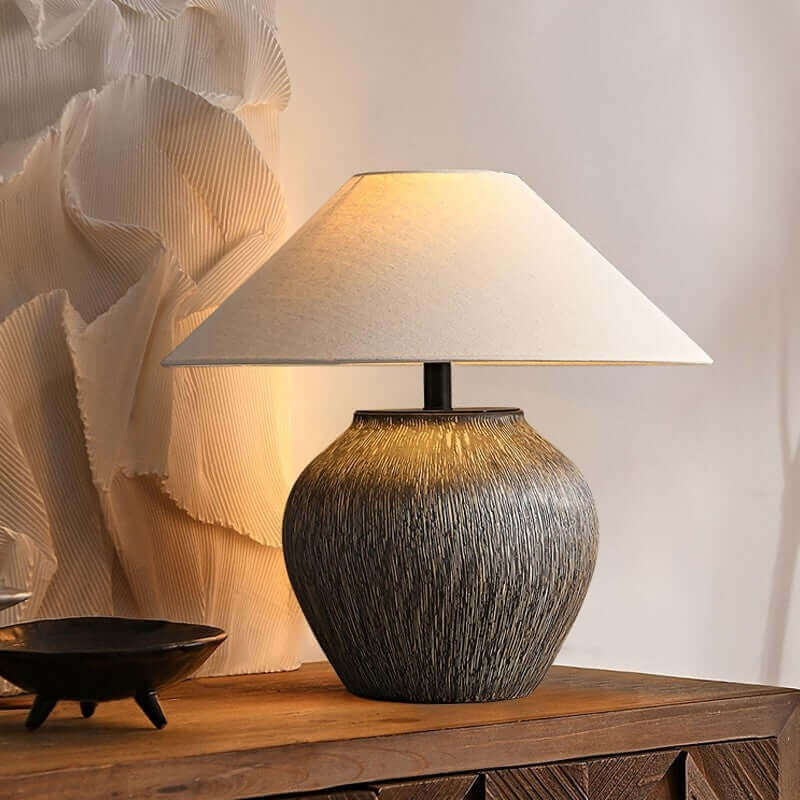 Introducing the Bayi Ceramic Table Lamp, a timeless masterpiece of handmade craftsmanship. Featuring an antique-inspired design reminiscent of hand-drawn clay pots, its delicate textures add rustic charm to any room. The classic beige fabric shade enhances its elegance, making it a perfect addition to your home decor.