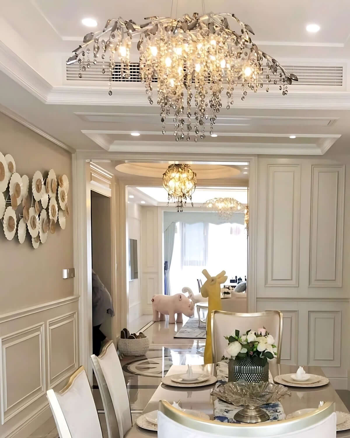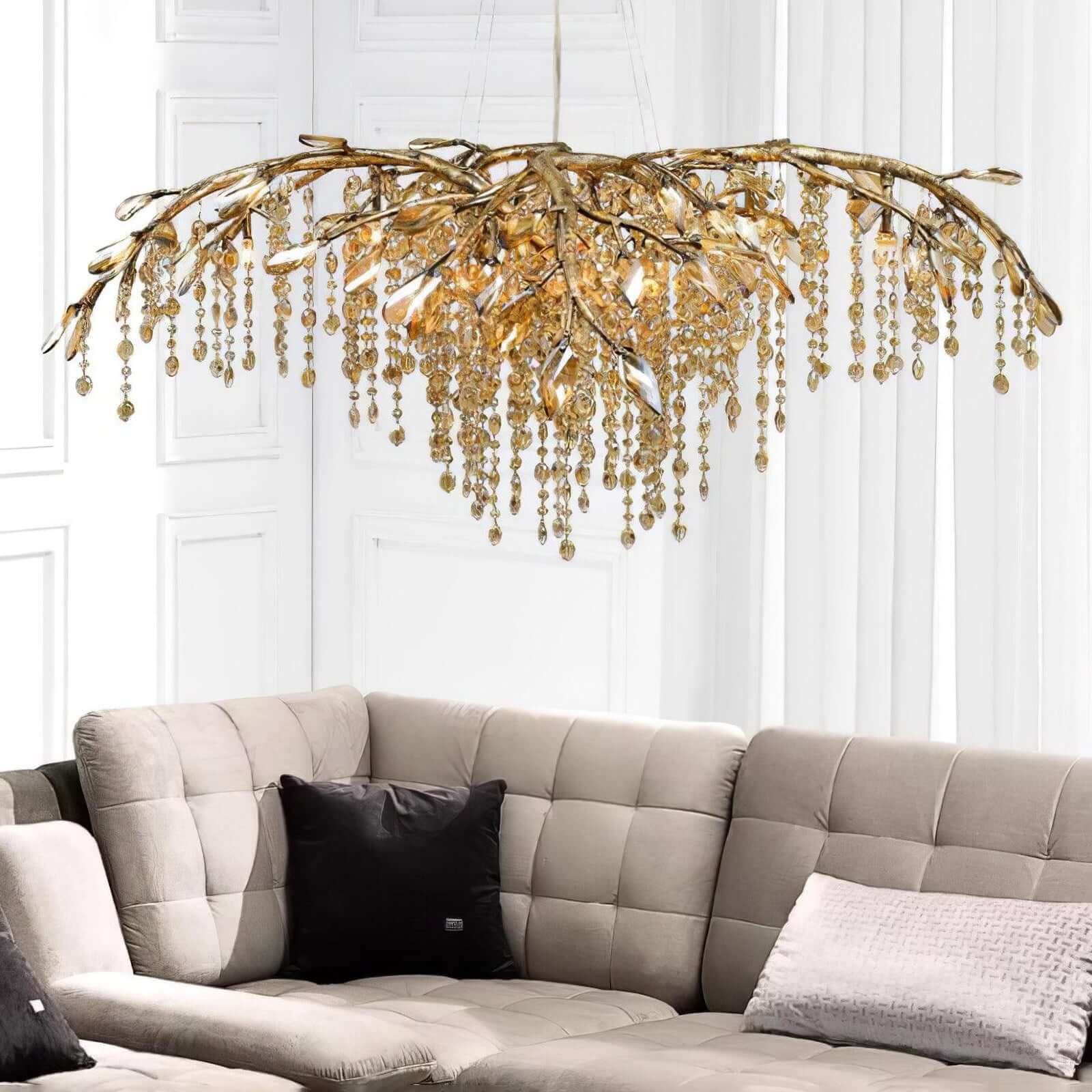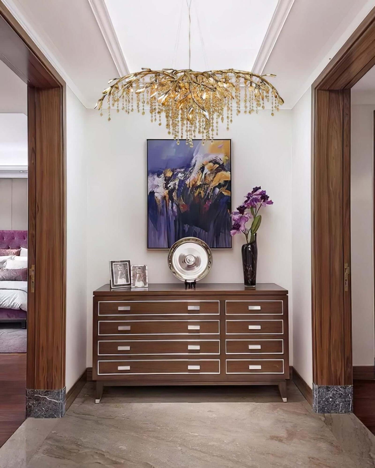 Inspired by nature, this chandelier features golden branches adorned with crystal beads like dewdrops on a forest canopy. Warm candelabra light reflects across the shimmering crystals, creating a statement centerpiece for hallways, bedrooms, lobbies, or luxurious living spaces.