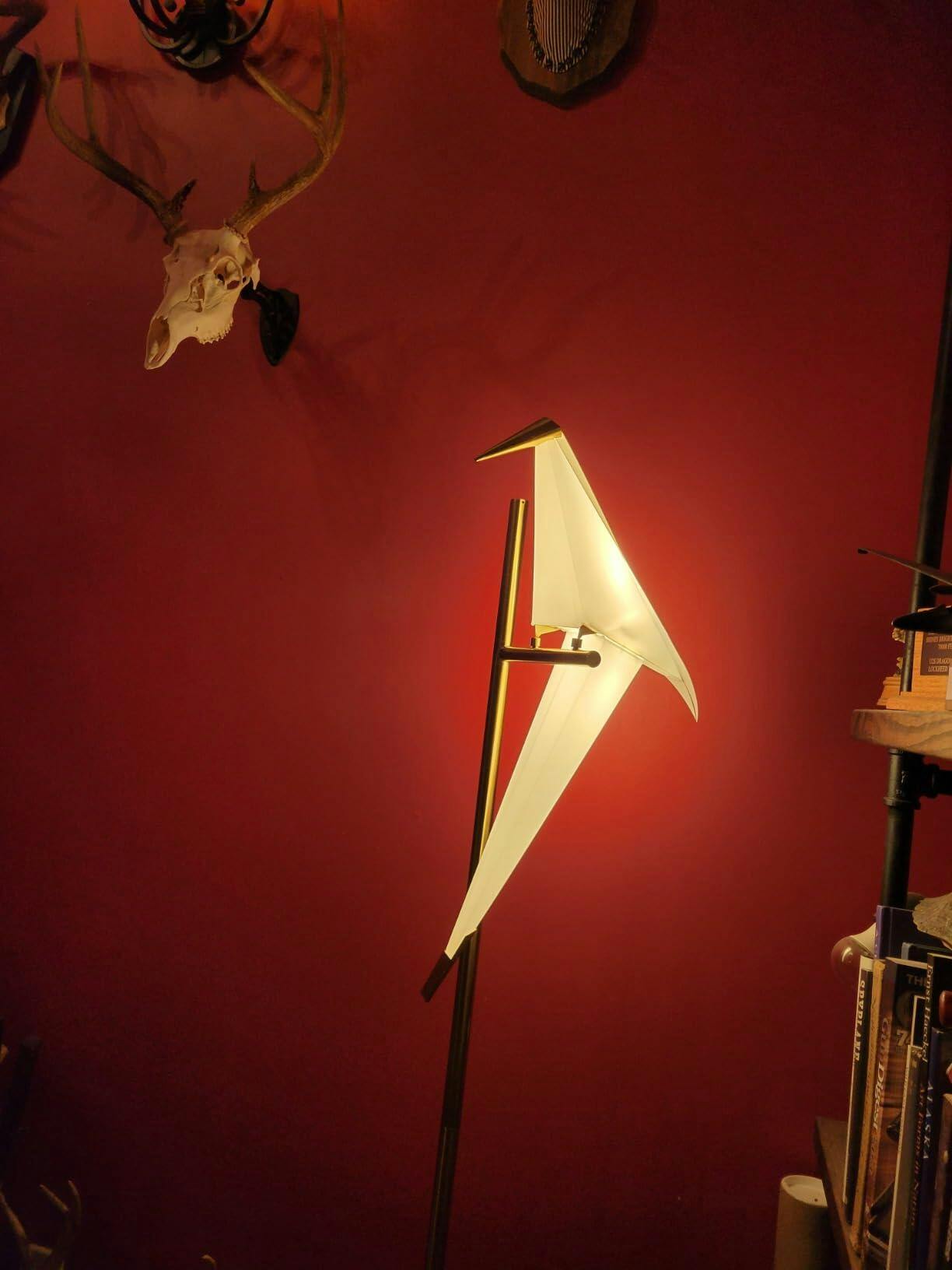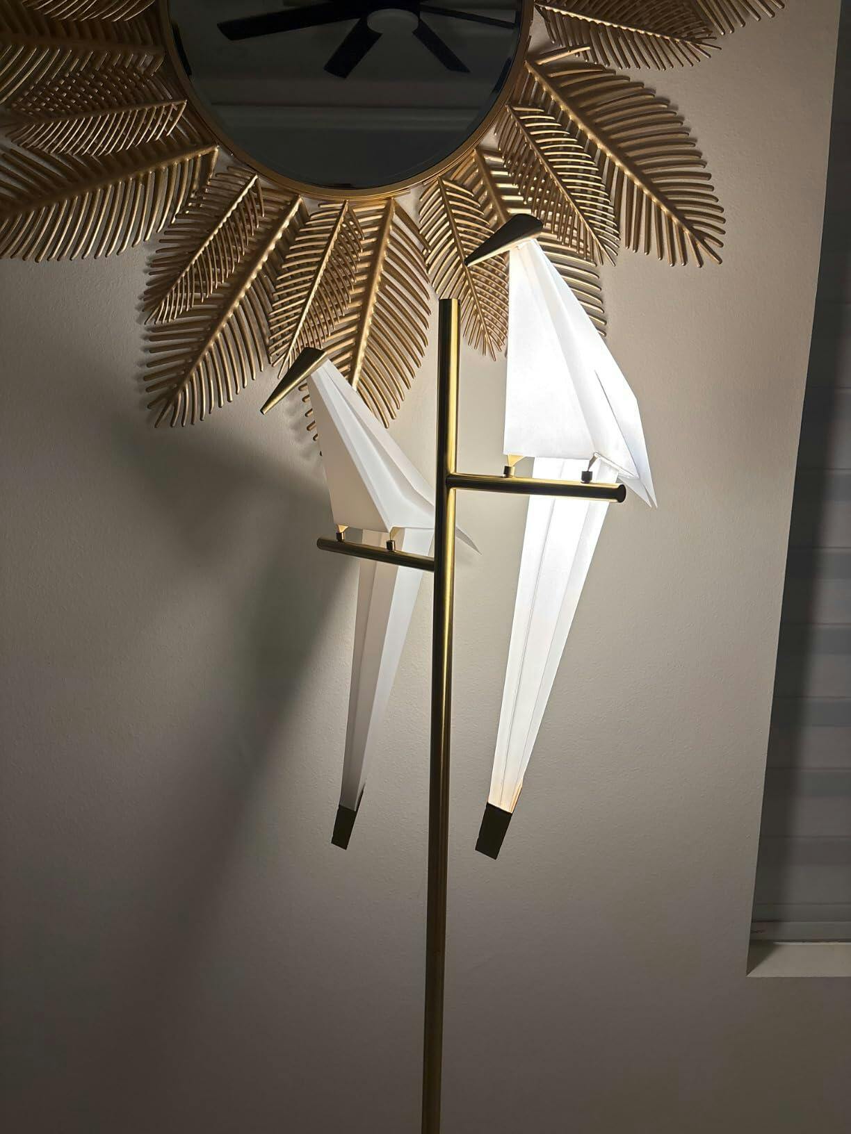 Stylish gold floor lamp shaped like a paper crane, perfect as an art deco entry lamp for a modern bedroom.