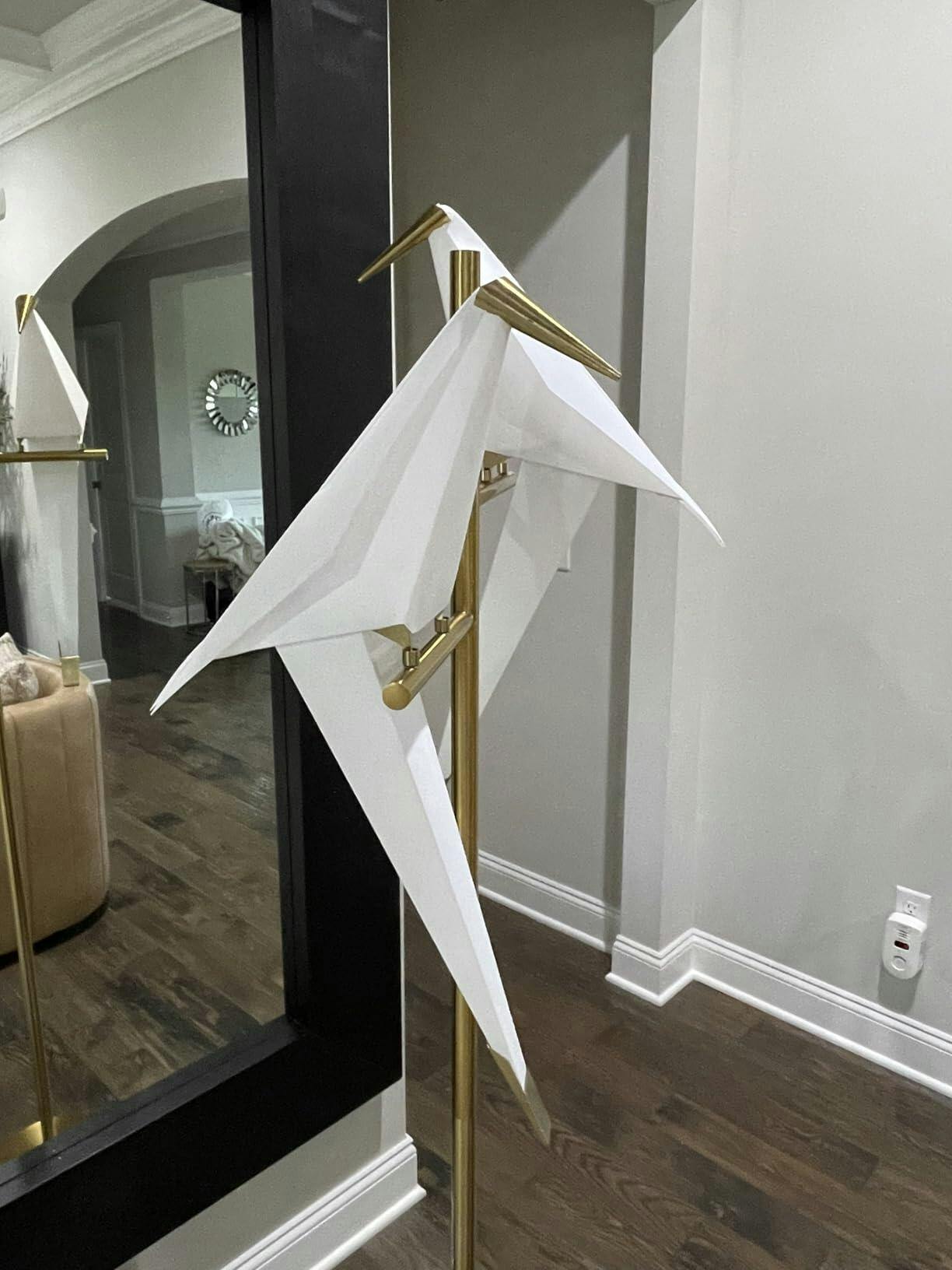 Stylish paper crane bird floor lamp in gold, perfect for art deco living room or entryway decor.