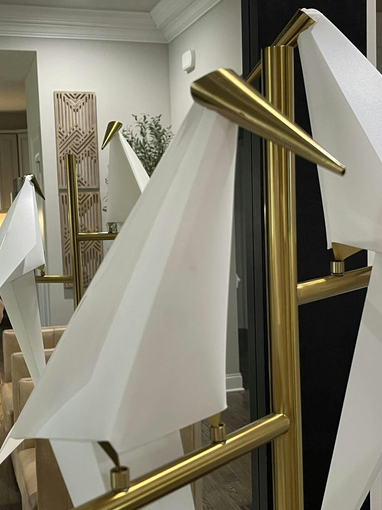 Elegant gold floor lamp shaped like paper cranes, perfect for entryway or living room decor, showcasing art deco style.