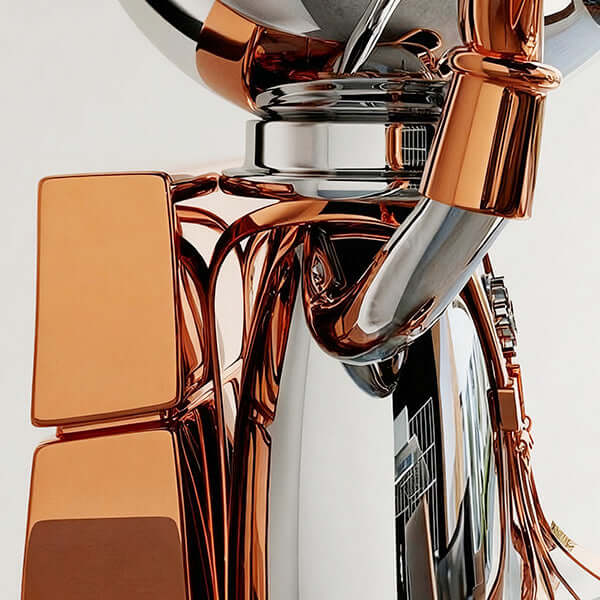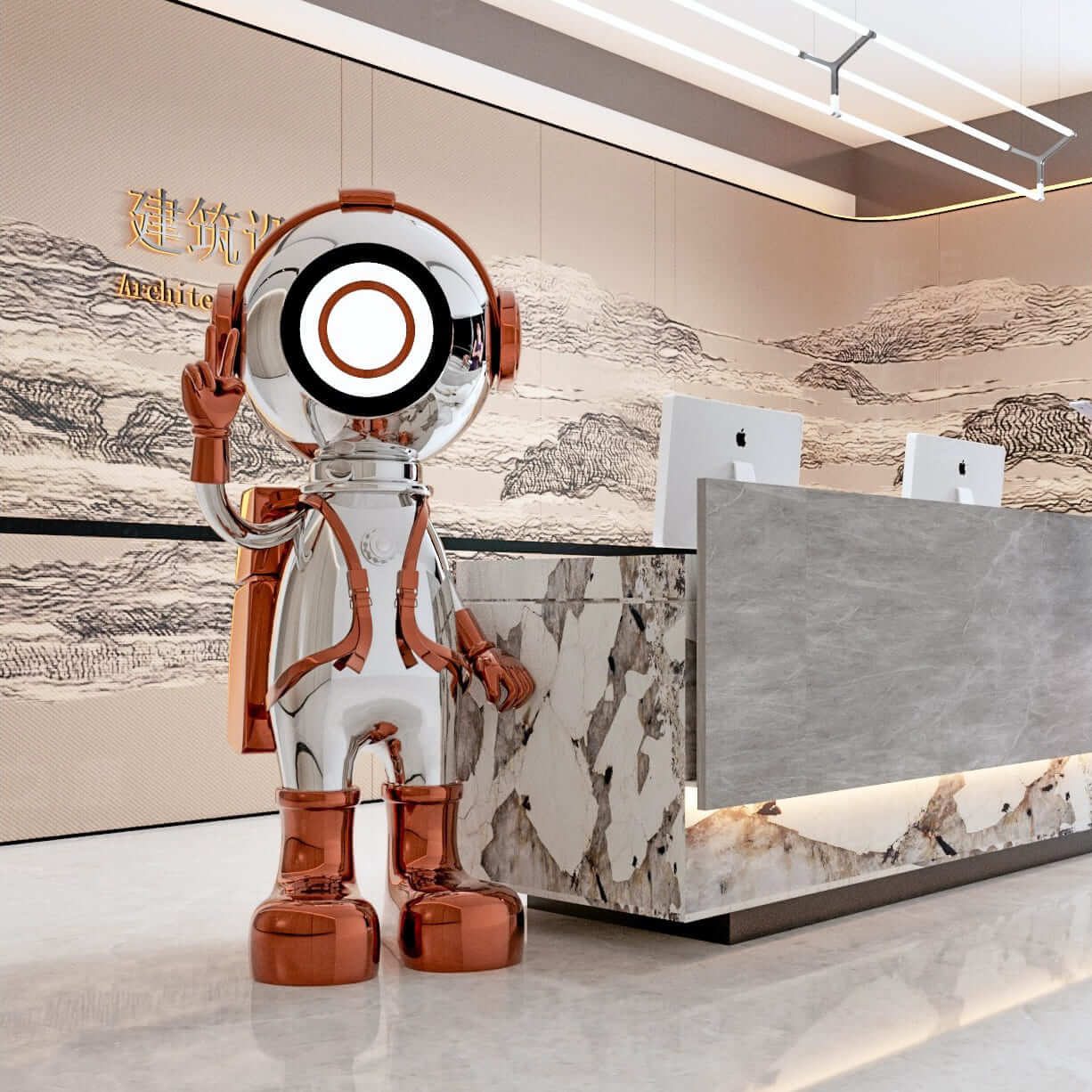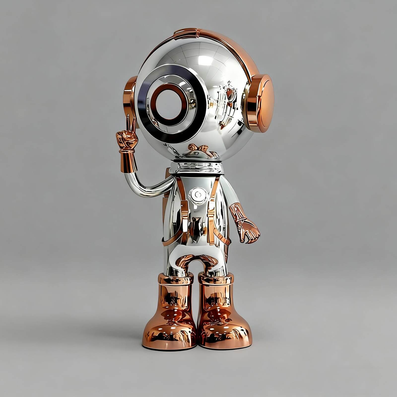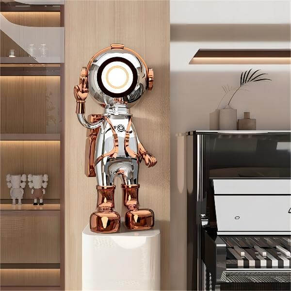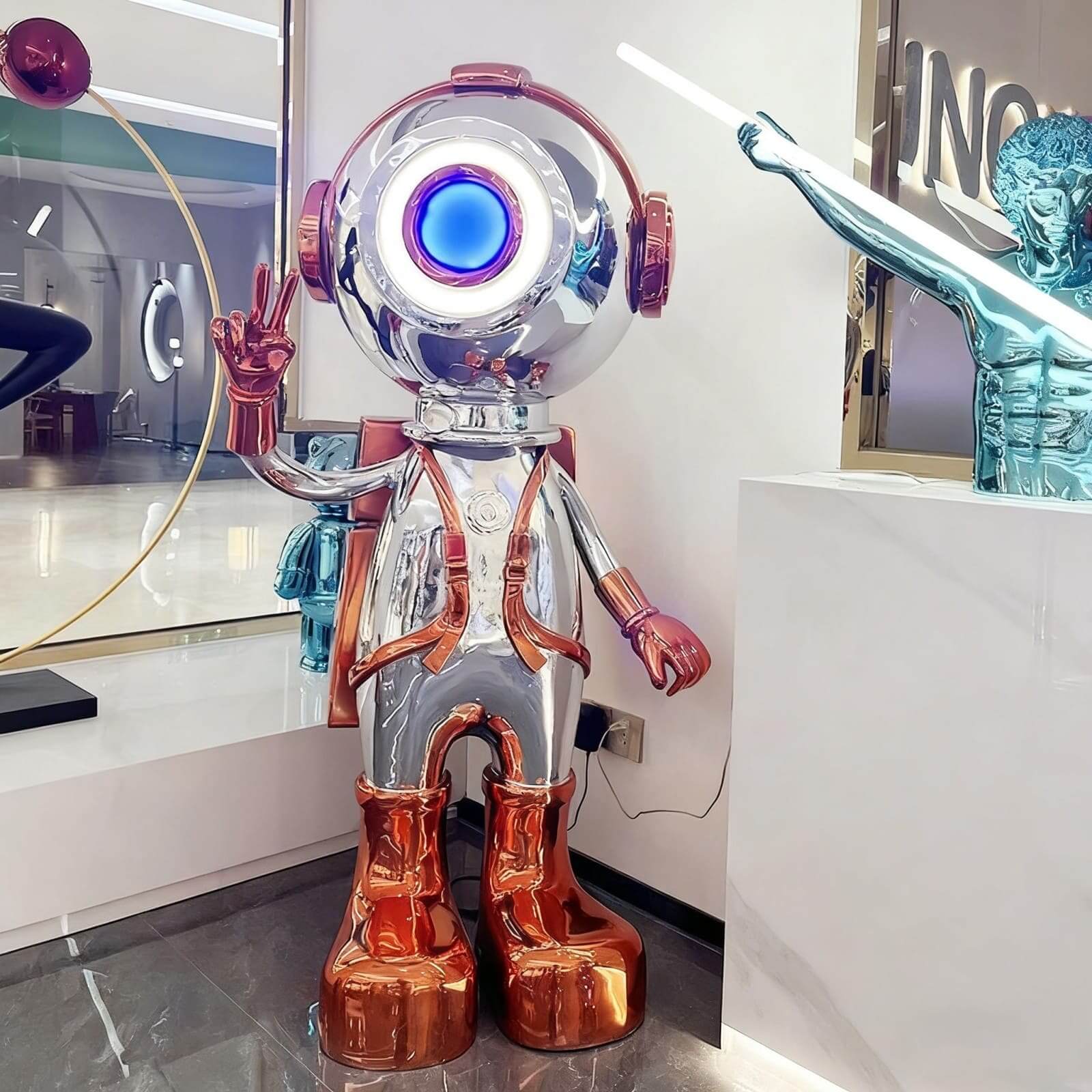 This sleek, space-age figure blends chrome and vibrant accents for a contemporary look that complements modern interiors.