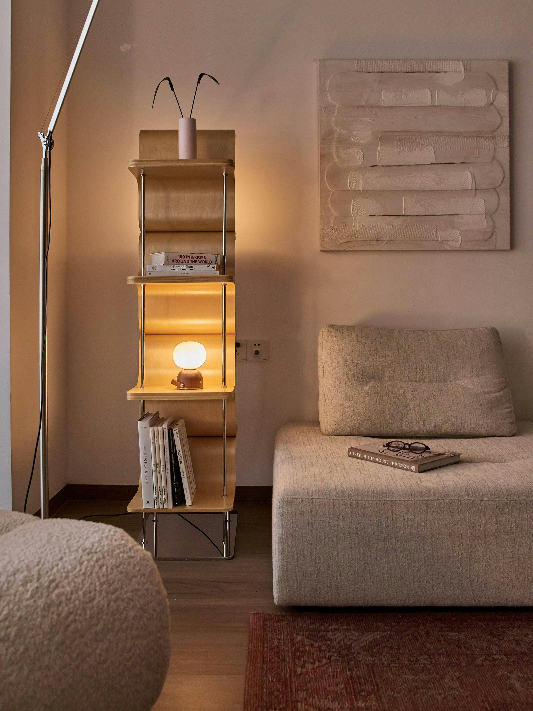 Cozy evening scene featuring the Luna Portable Table Lamp on a bedside table, providing soft light in a stylish bedroom.
