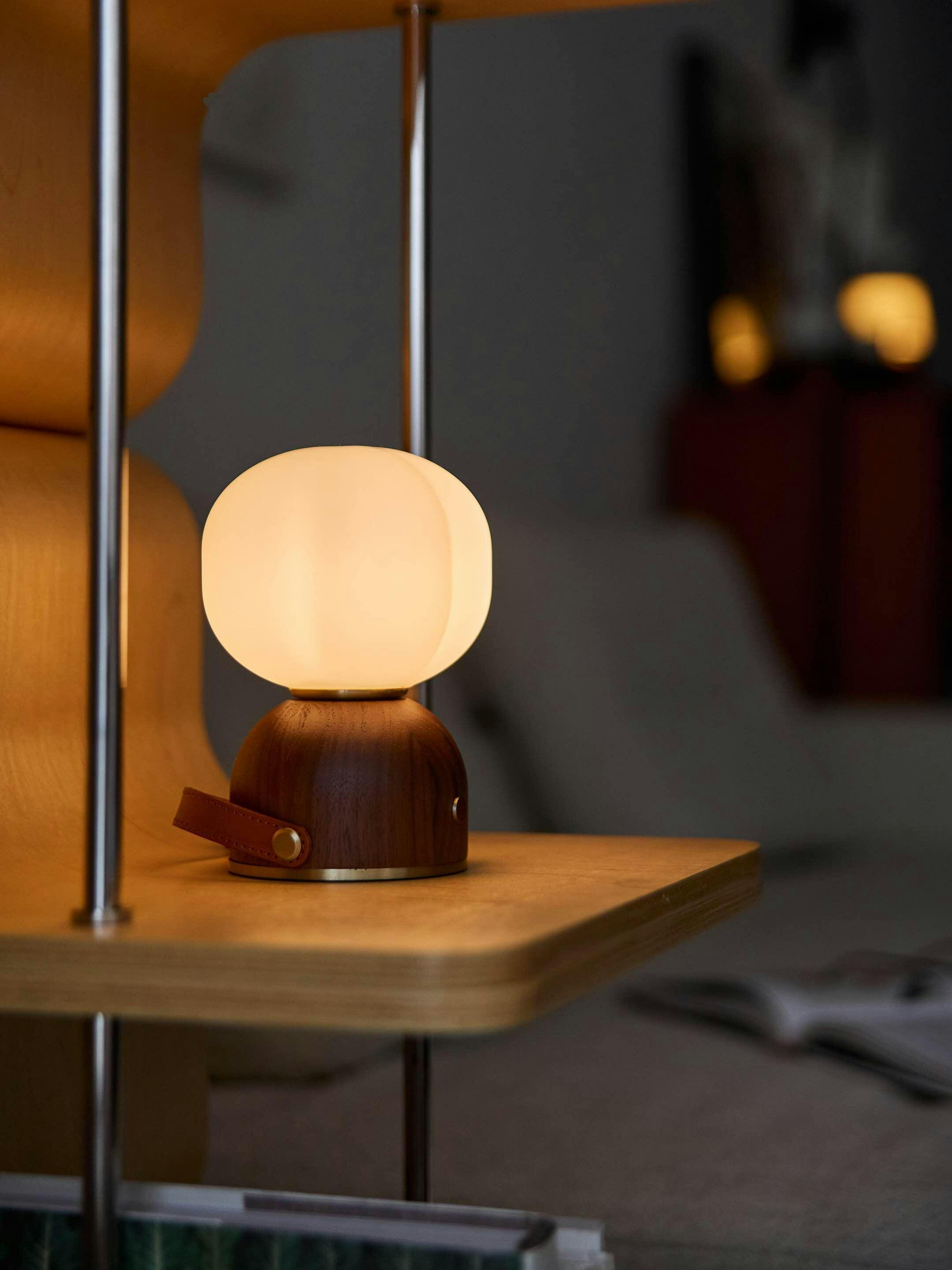 Luna Portable Table Lamp in a stylish design, featuring a soft glass shade and convenient rechargeable battery.