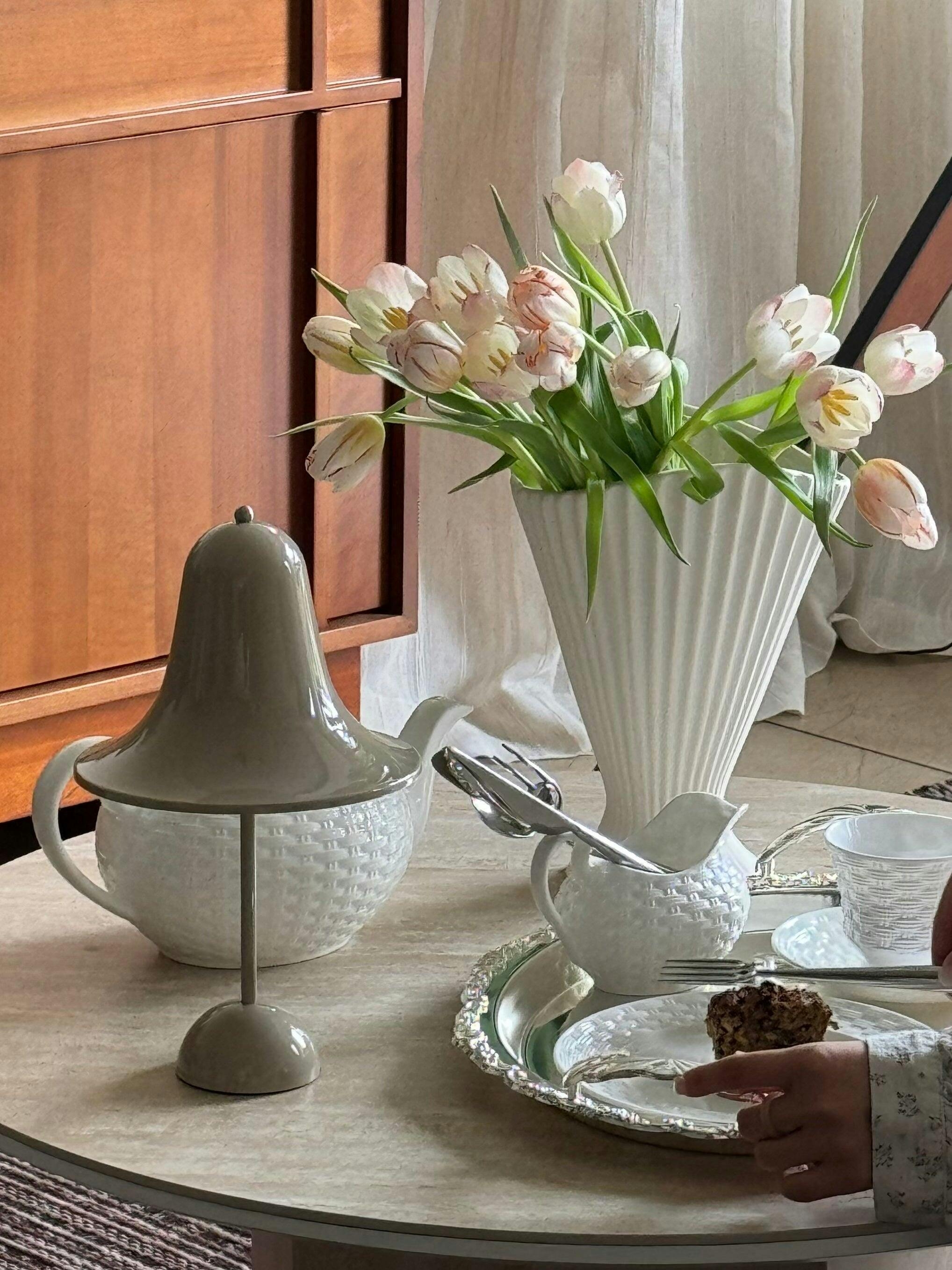 Pantop portable table lamp with a round shade, perfect as a bedside or dining table lamp, featuring a sleek design and warm light.