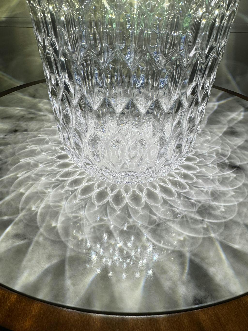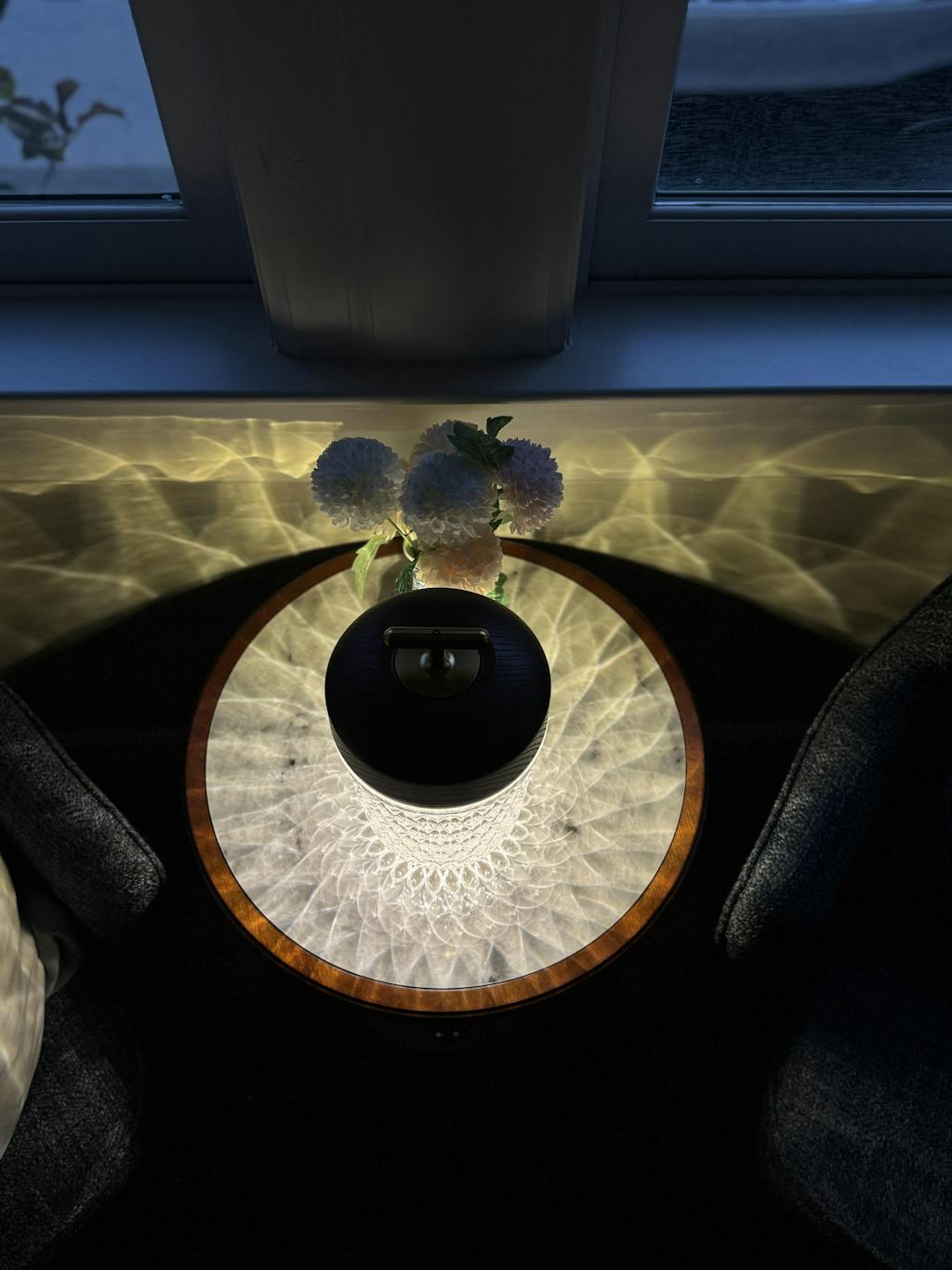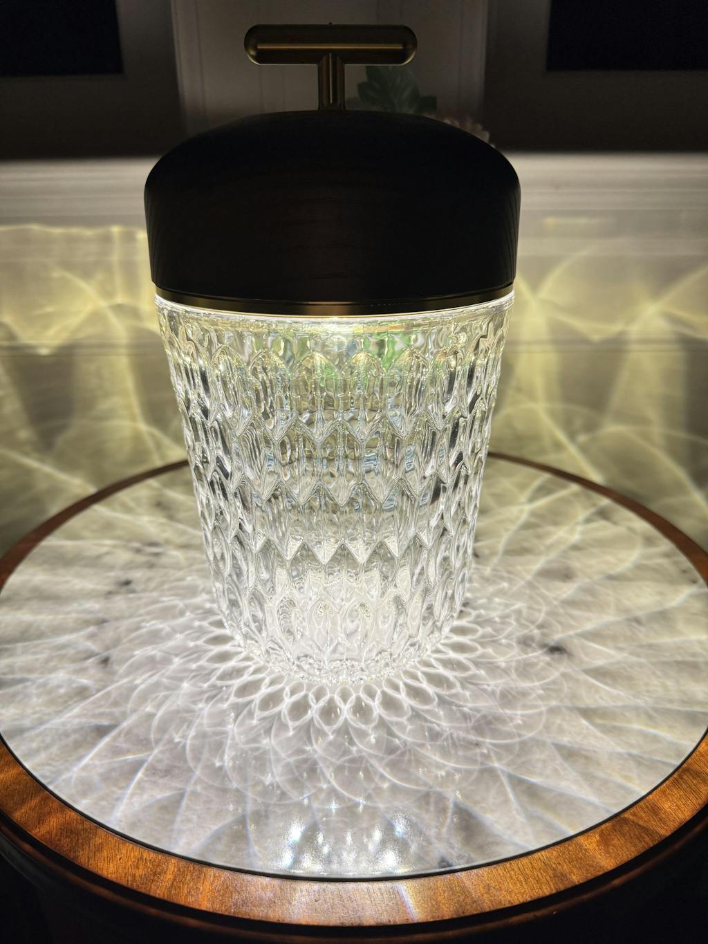 Folia Portable Lamp: a rechargeable crystal table lamp with modern art deco design, illuminating a beautiful pattern on the surface.