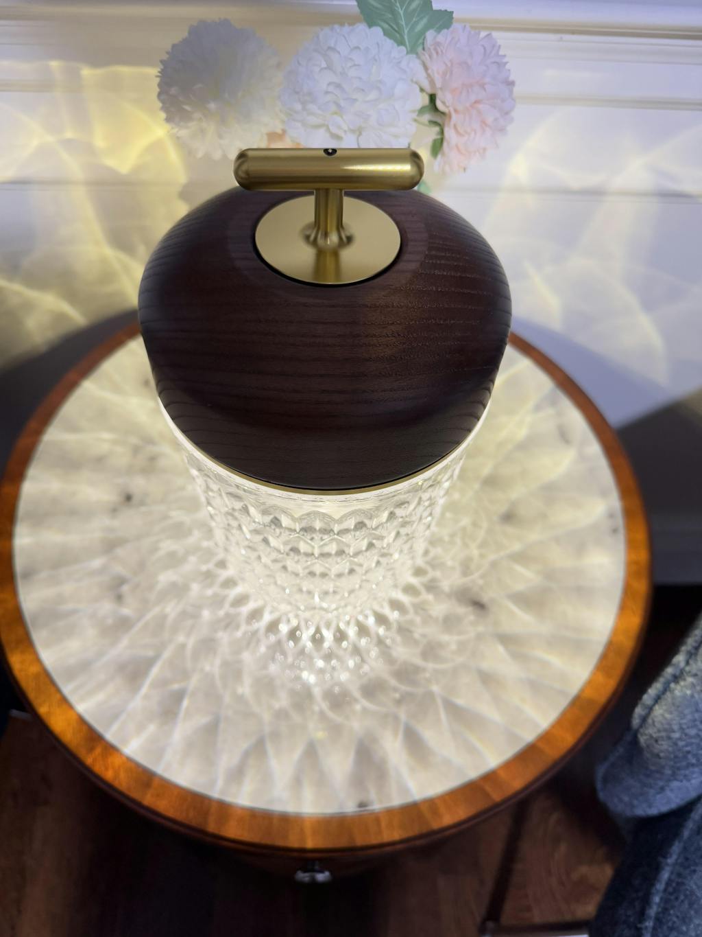 Folia portable lamp featuring a crystal design and wood accent on a table, ideal for modern and art deco decor.