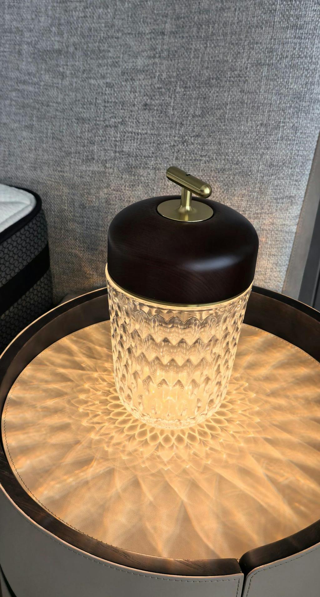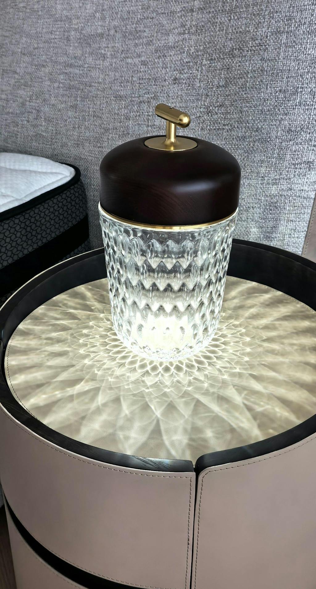 Stylish crystal jar with wooden lid and gold handle, perfect for modern decor. Includes charger and cable.