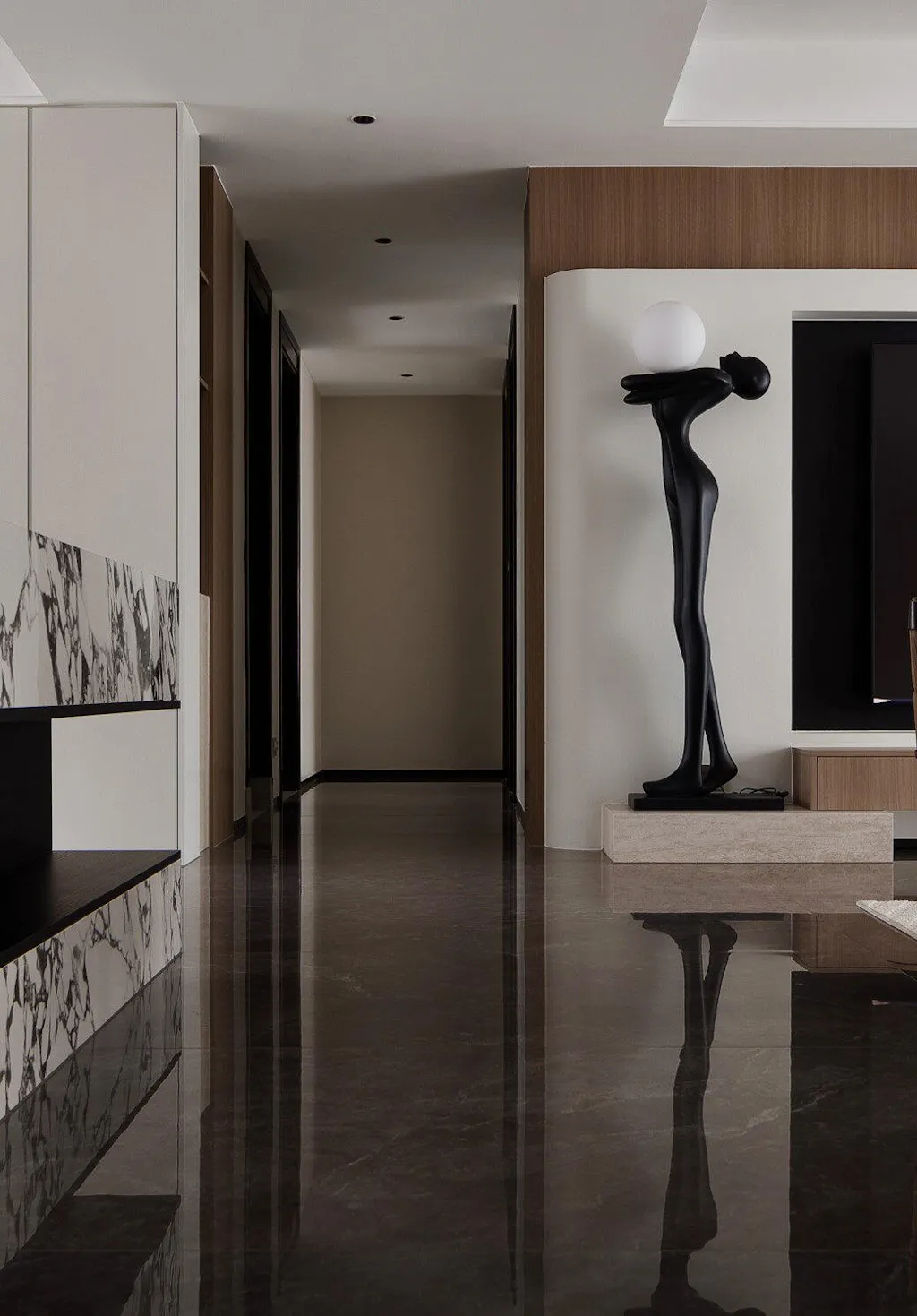 Sculptural art deco floor lamp in a modern hallway, featuring a glowing round shade and sleek black design.