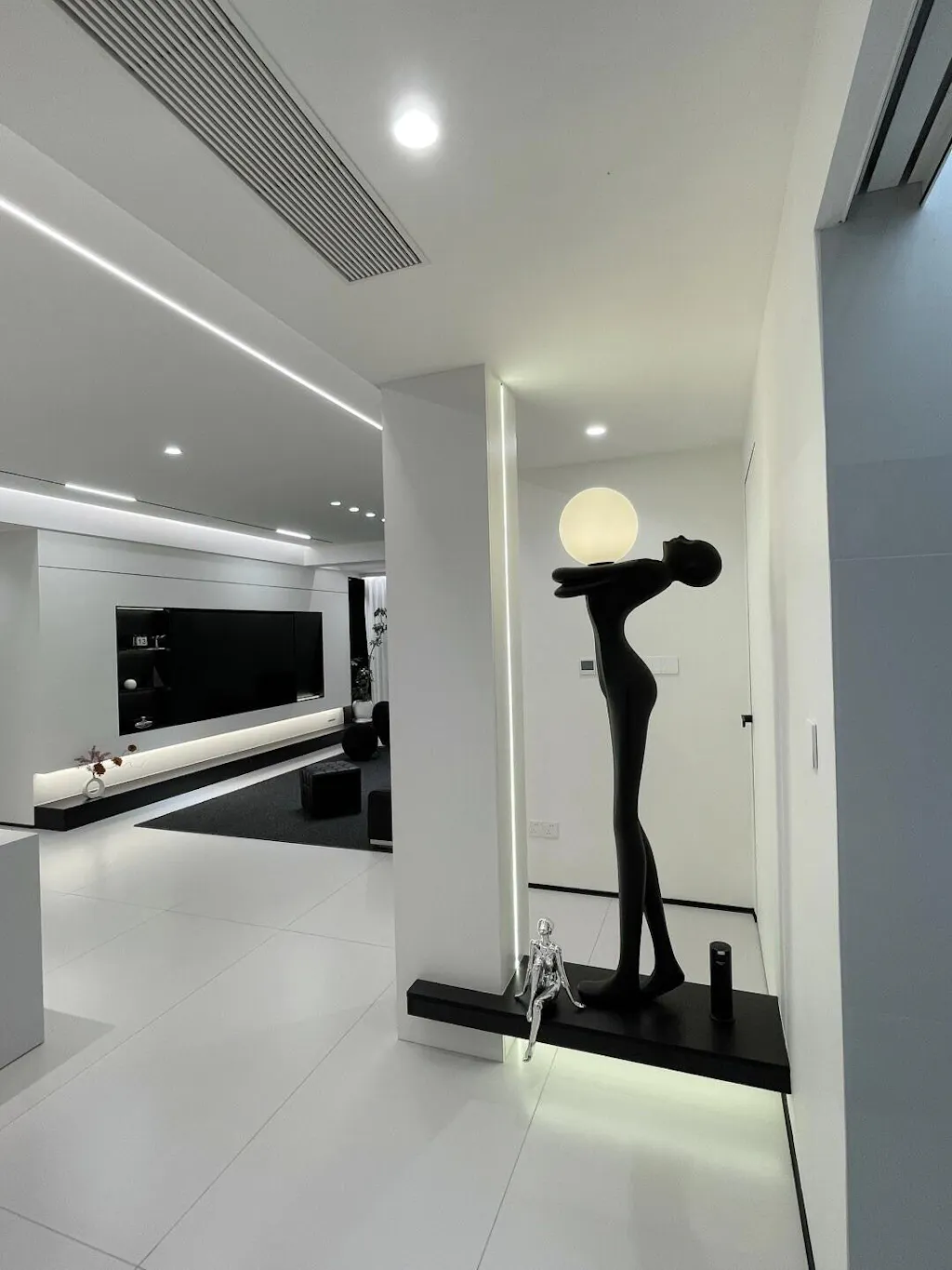Sculptural art deco floor lamp in a modern living room, featuring a stylish black figure holding a glowing orb.