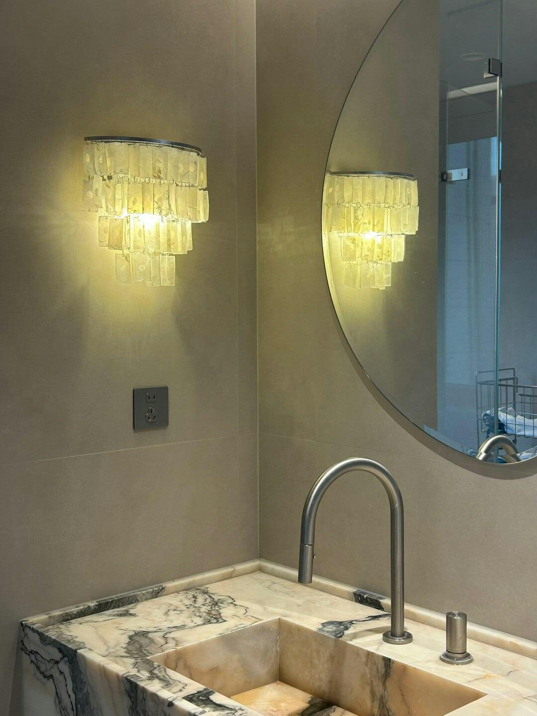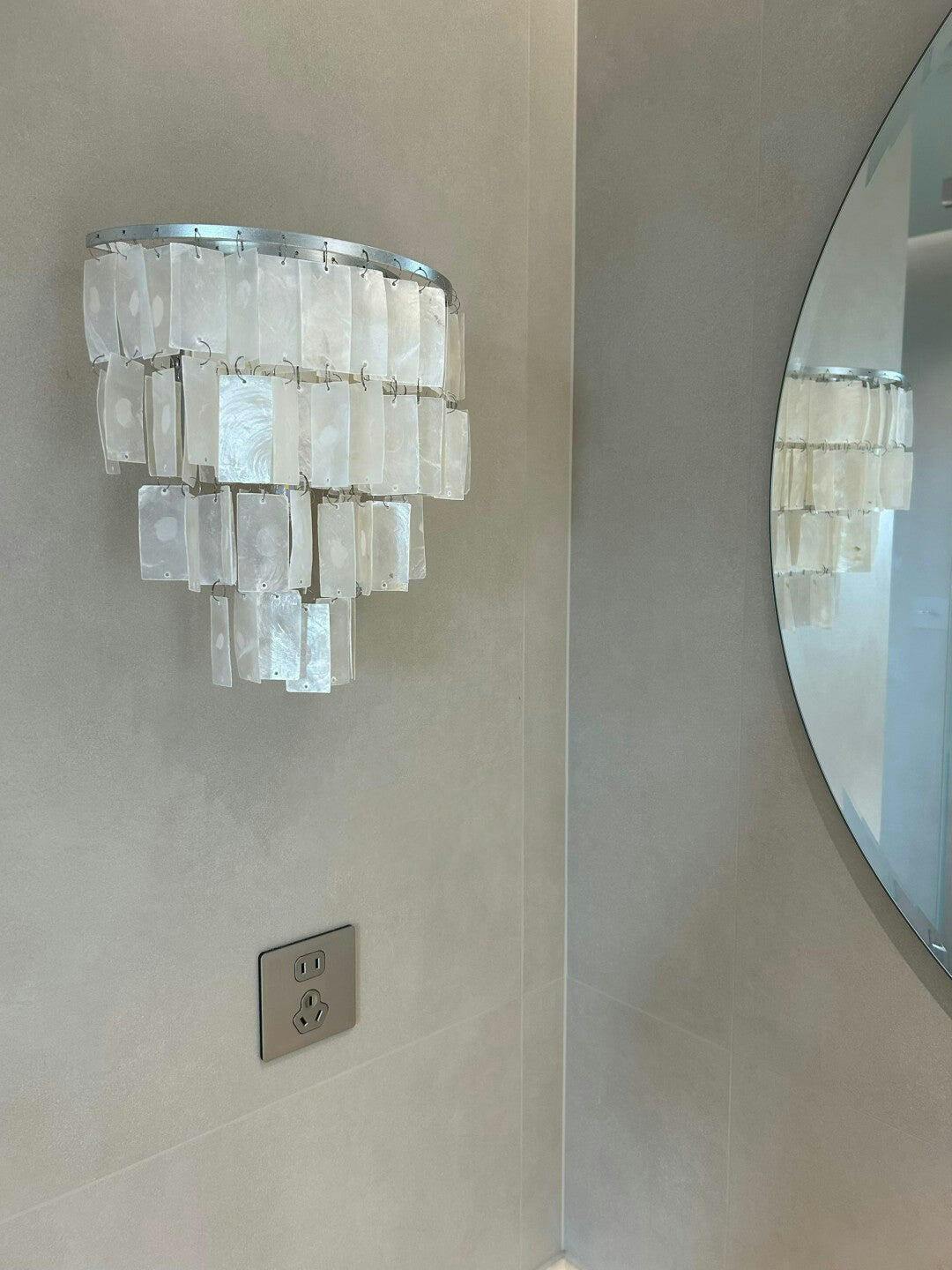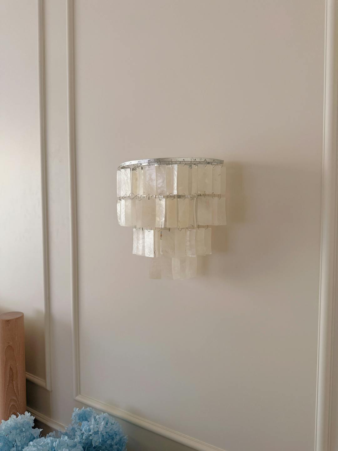 Light up your space with the Tiered Wall Lamp—a blend of modern style and natural beauty. With a sleek silver frame and layers of Natural White Mother of Pearl shells, it gives off a soft, pearlescent glow. Perfect for adding a calm, elegant touch to any room in your home.