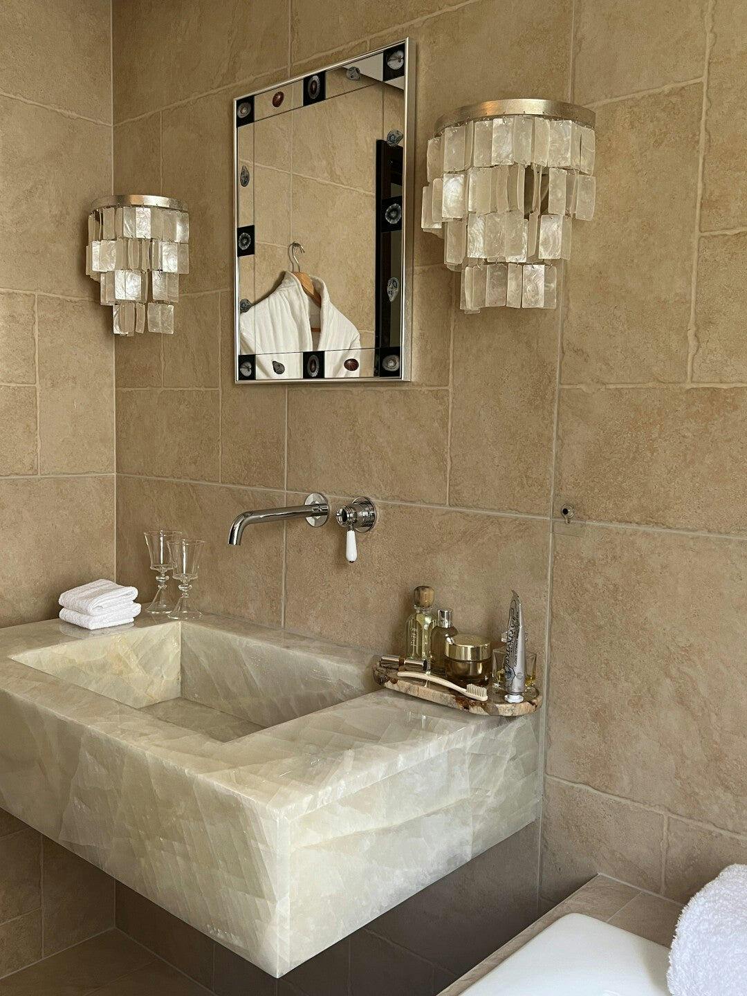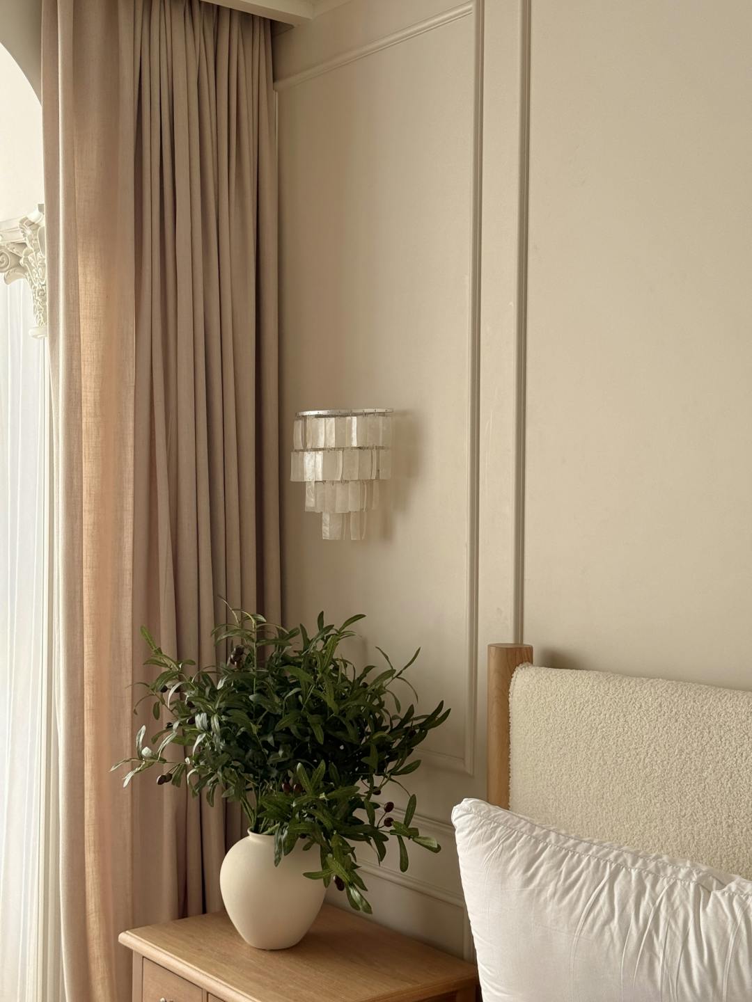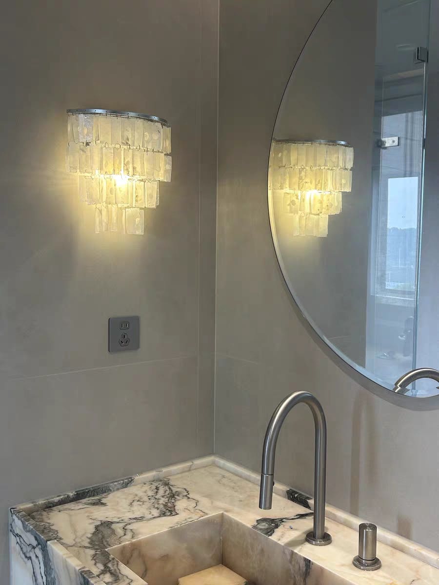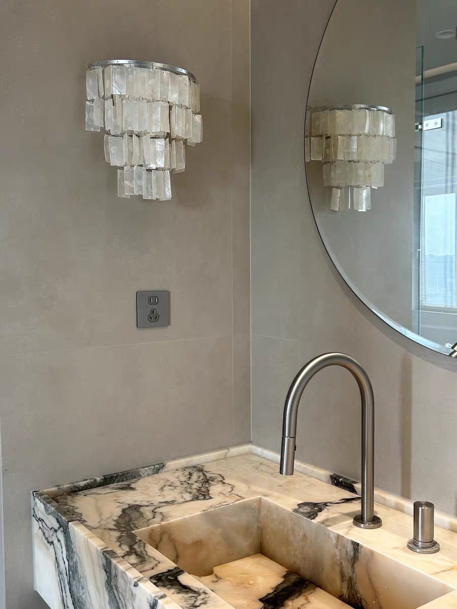 Light up your space with the Tiered Wall Lamp—a blend of modern style and natural beauty. With a sleek silver frame and layers of Natural White Mother of Pearl shells, it gives off a soft, pearlescent glow. Perfect for adding a calm, elegant touch to any room in your home.