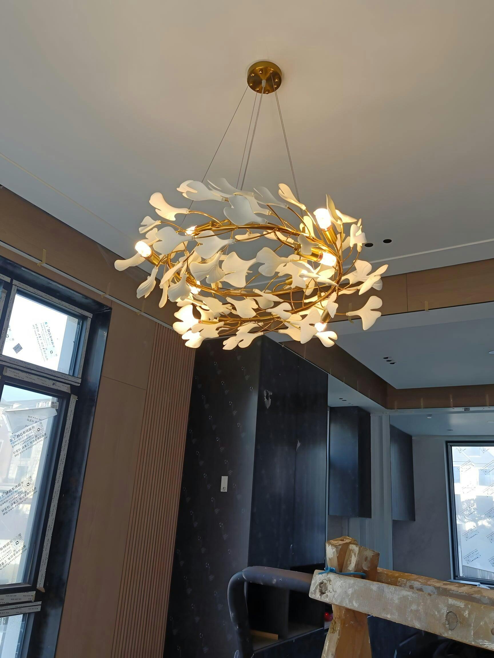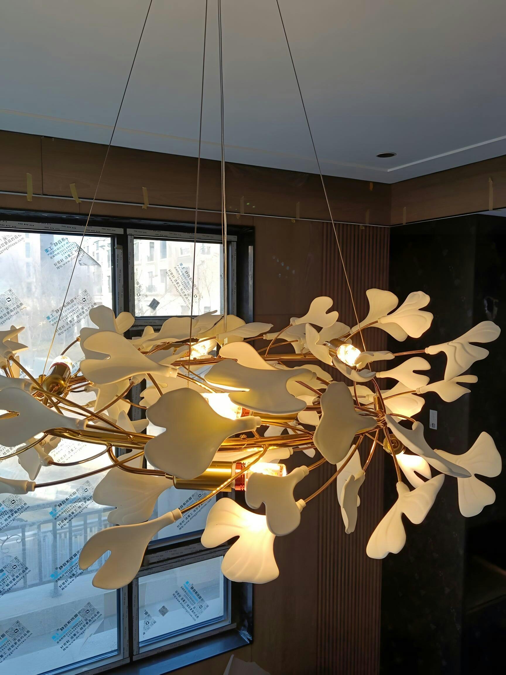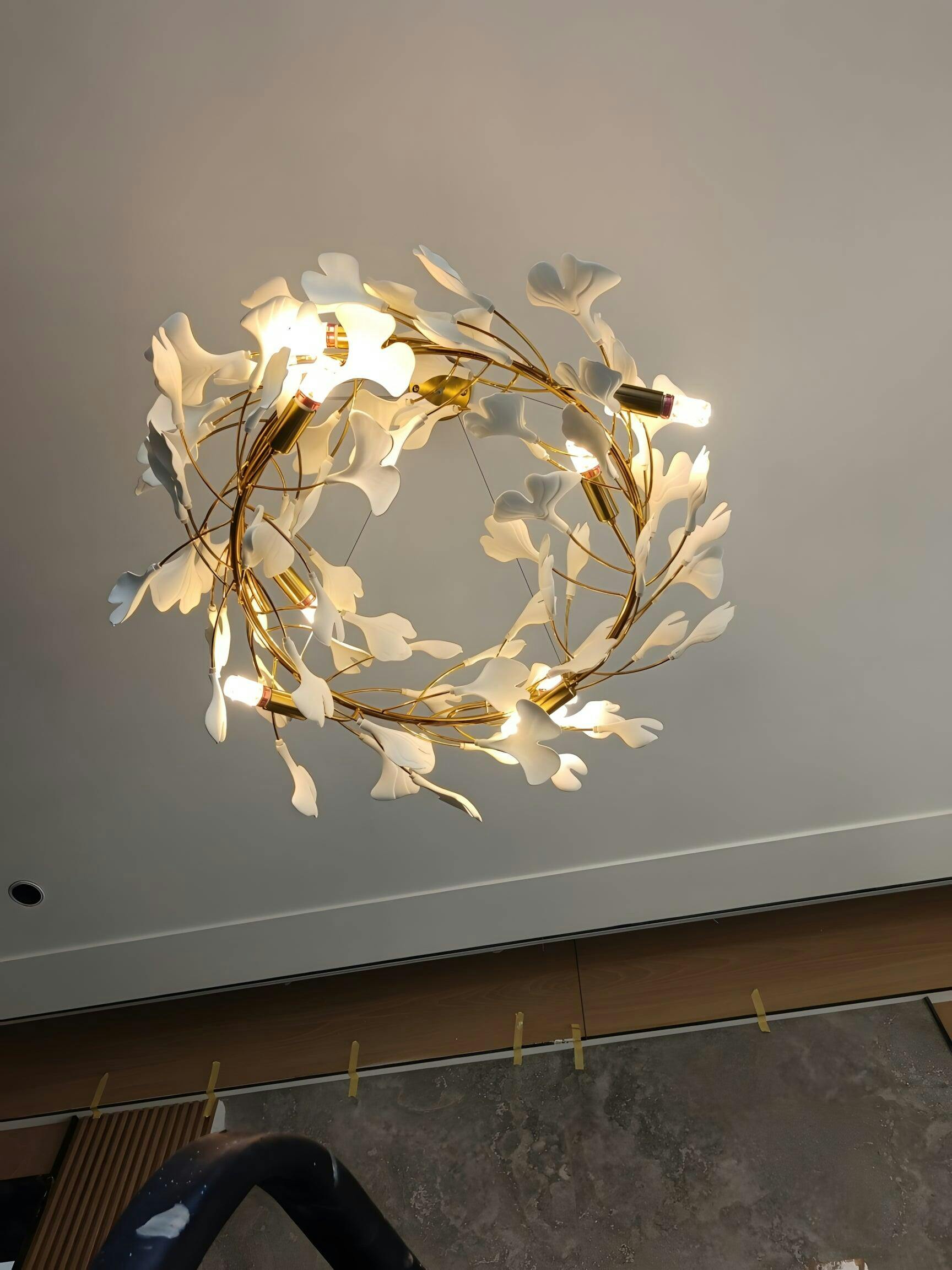 Transform your space with the Gingko Chandelier. Crafted from intricate, handcrafted porcelain leaves, this chandelier radiates warmth and elegance. Its natural, dynamic design mimics the energy of living plants, creating a soothing and rejuvenating atmosphere. A true work of art and light!