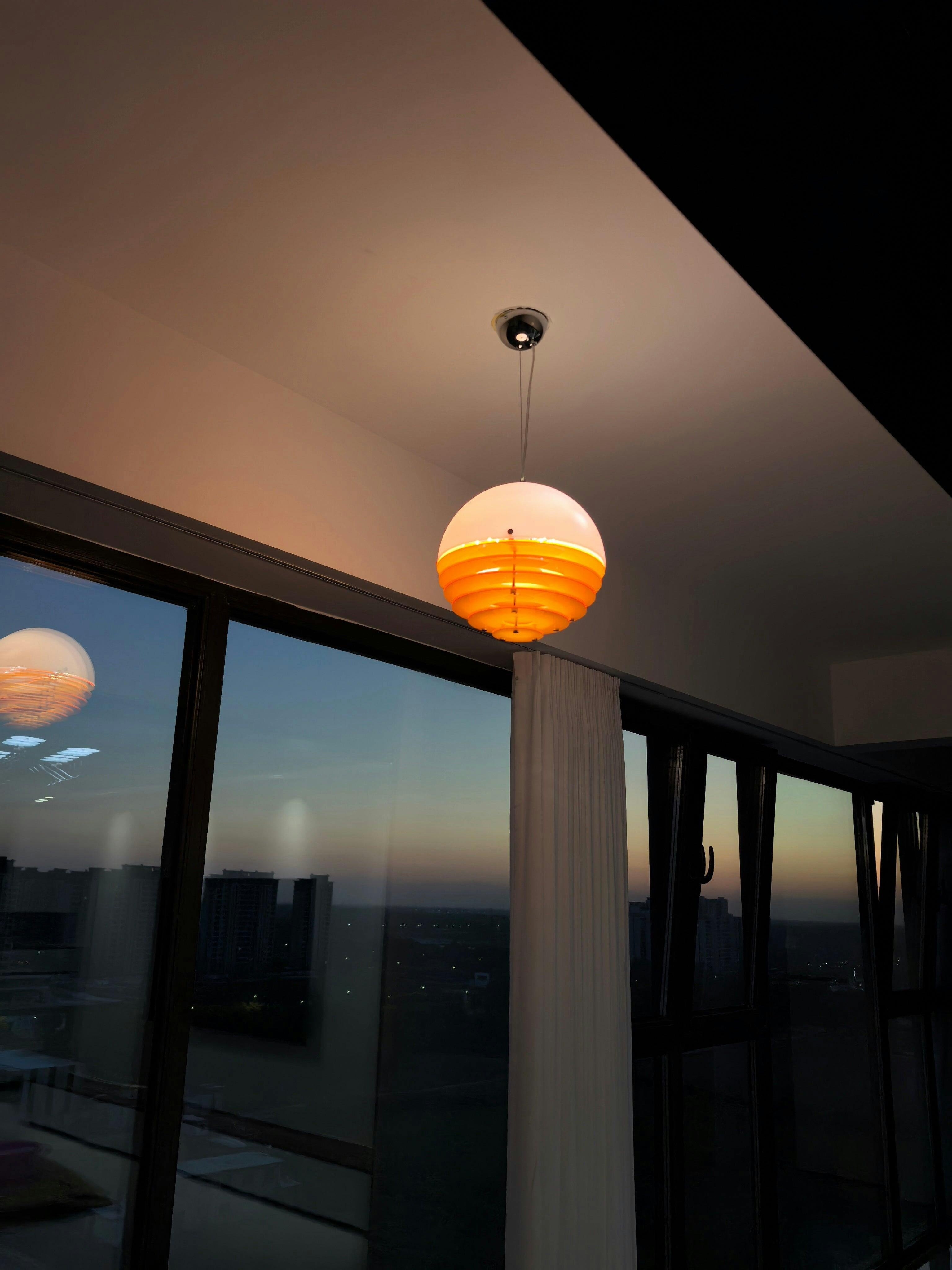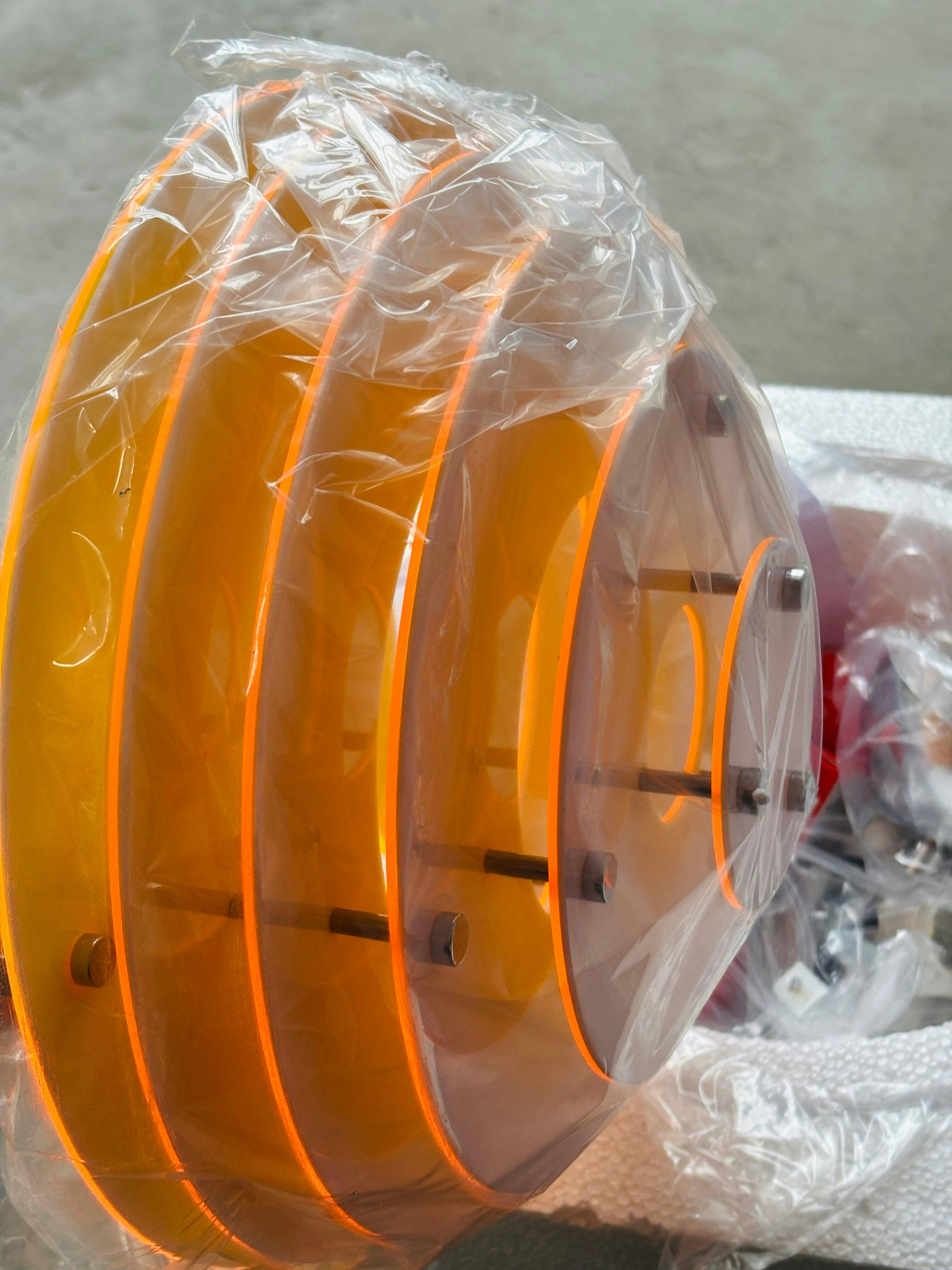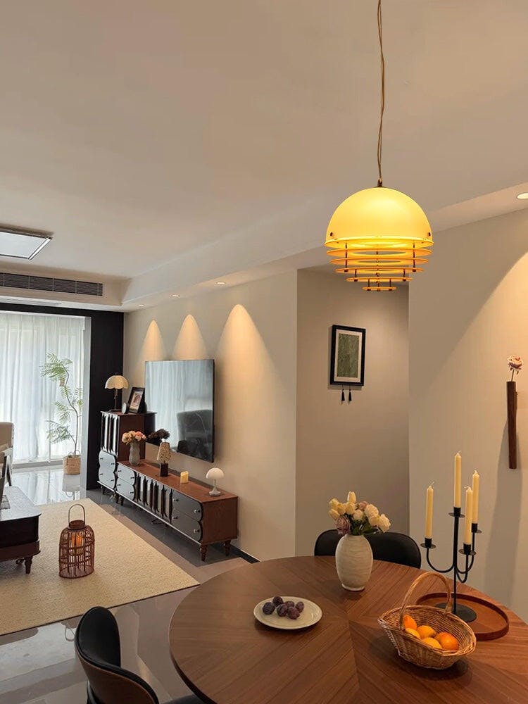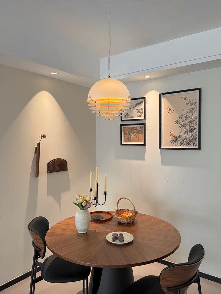 Add a touch of elegance and warmth to your space with the Lumora Pendant Light. This stunning light fixture features a domed glass top and layered acrylic discs in a beautiful amber hue, creating a gradient glow that brings cozy, ambient light to any room. Ideal for kitchens, lounges, or creative studios, its unique design combines sculptural beauty with soft illumination, making it the perfect modern centerpiece.