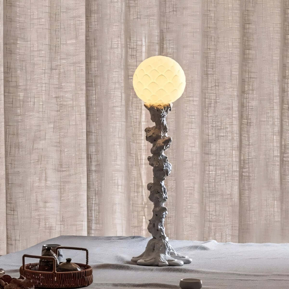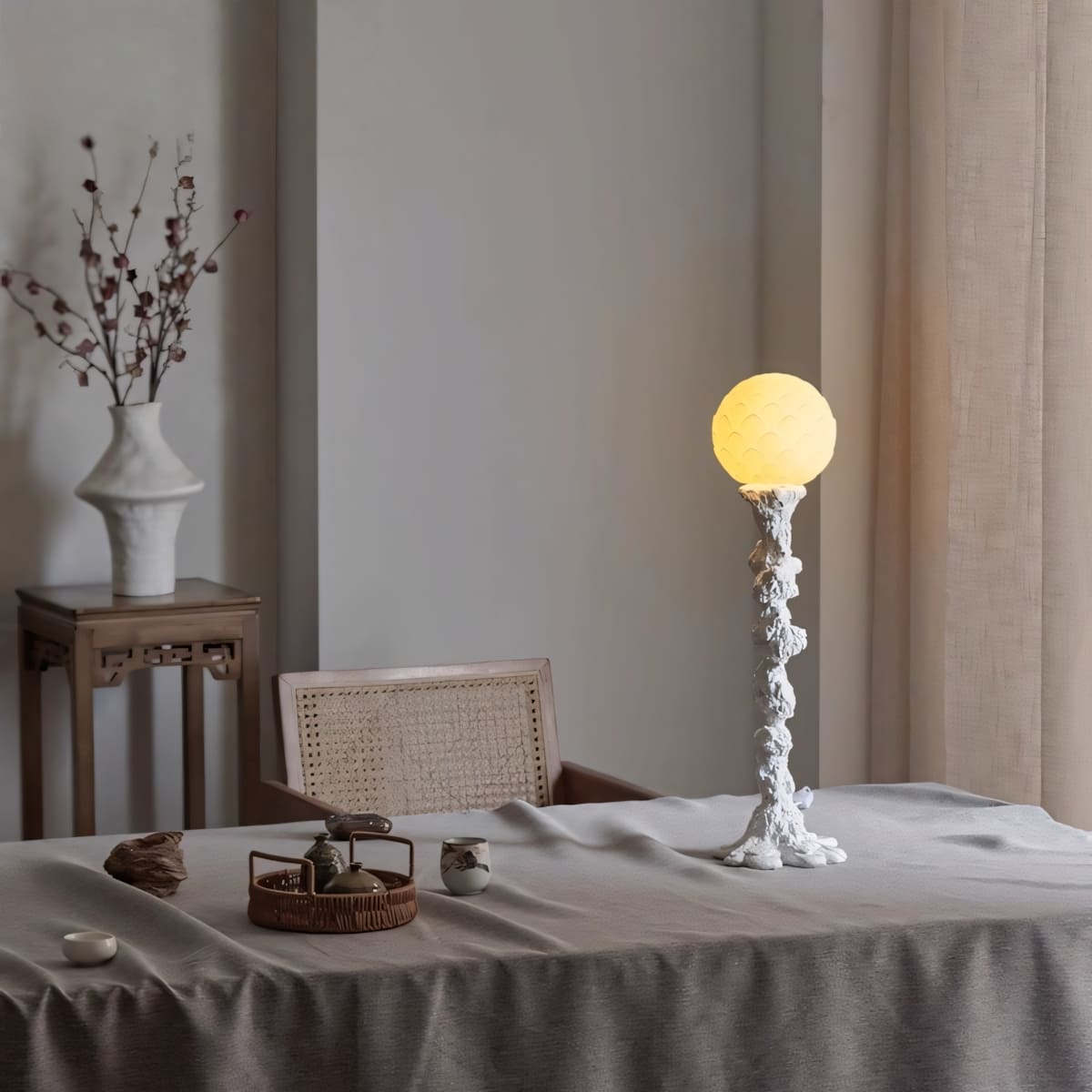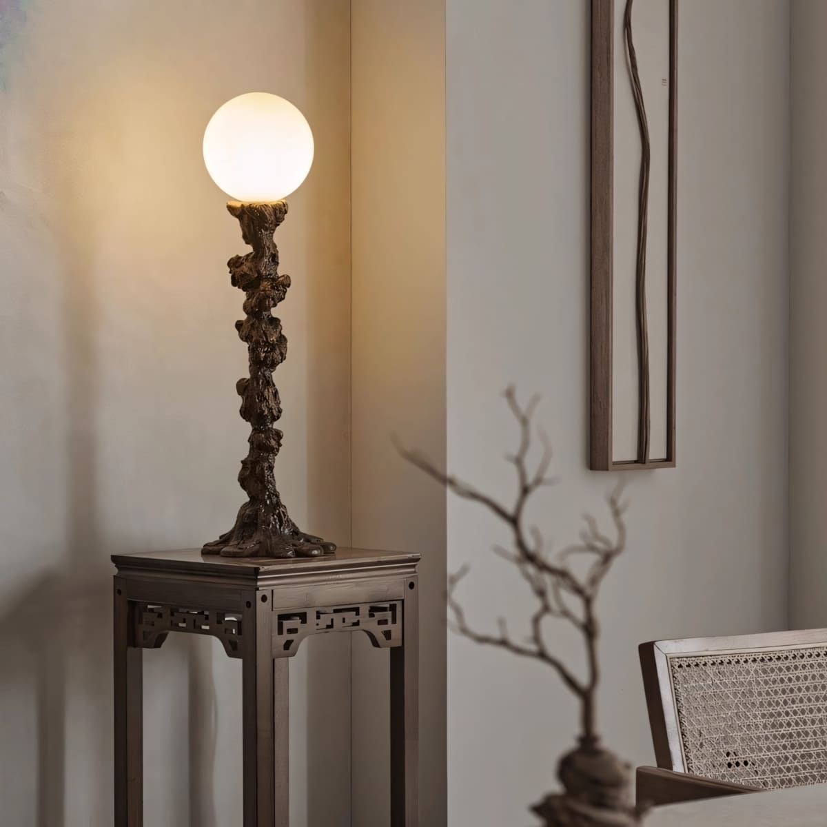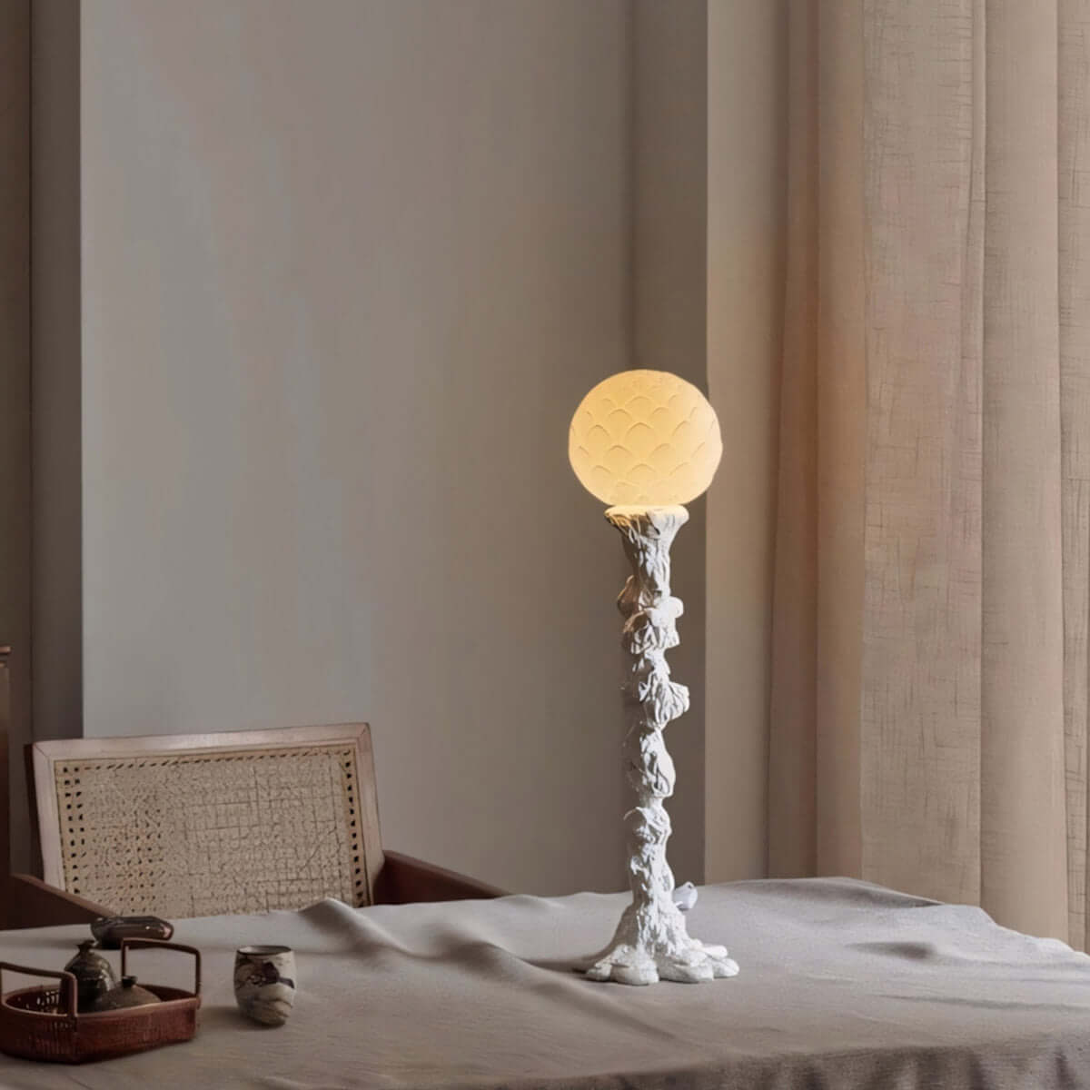 Discover timeless serenity with the Reyoro Table Light. Crafted from tree trunk–inspired resin and paired with an art glass shade, it embodies Wabi-Sabi elegance and organic beauty. Perfect for bedrooms, studies, or modern living rooms, it softly illuminates your space with a peaceful, enduring charm.