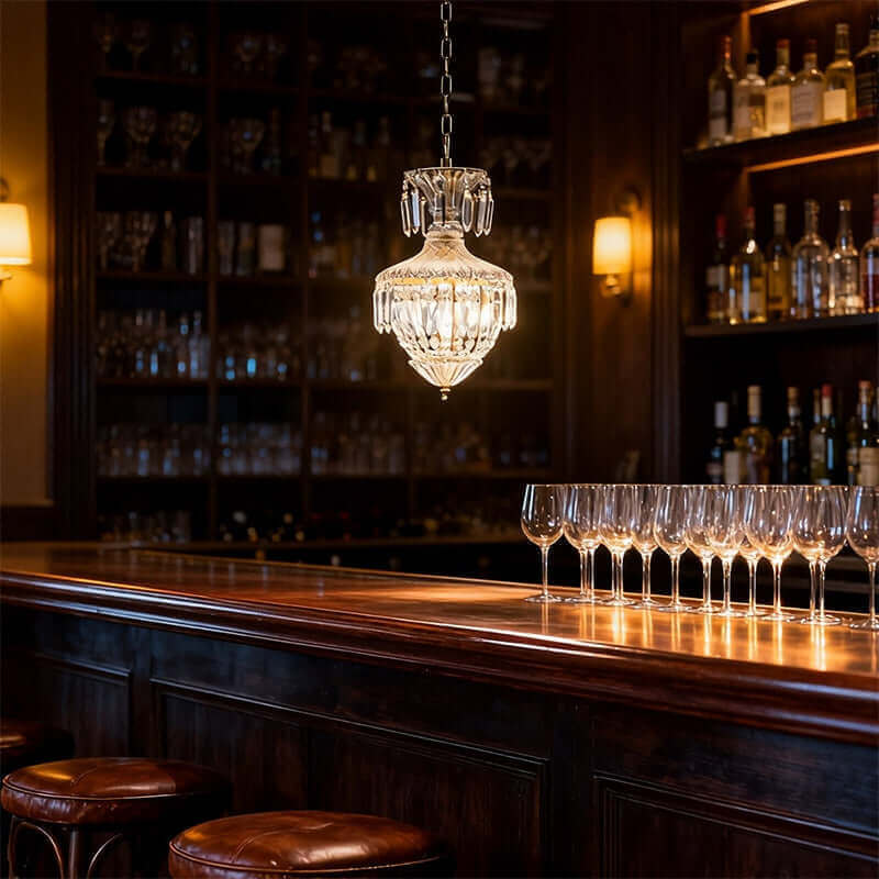 A striking chandelier above the bar enhances furniture and defines upscale living spaces.