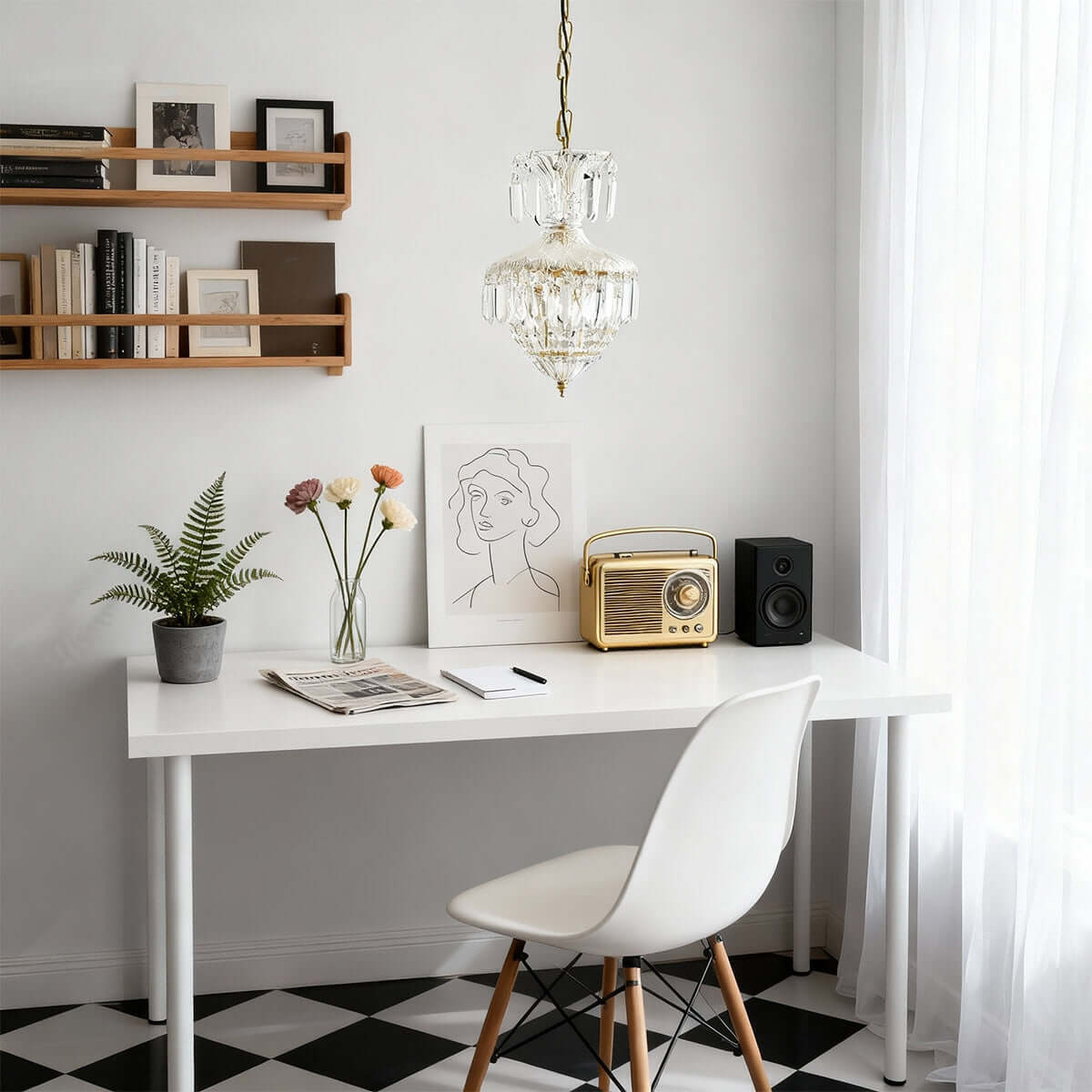 Glass shade with crystal accents delivers dazzling luxury and a glamorous focal point.