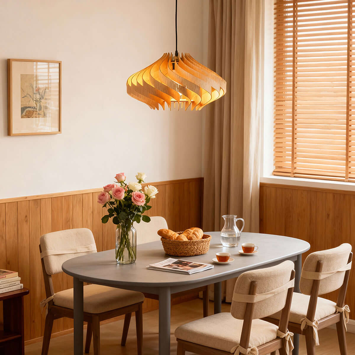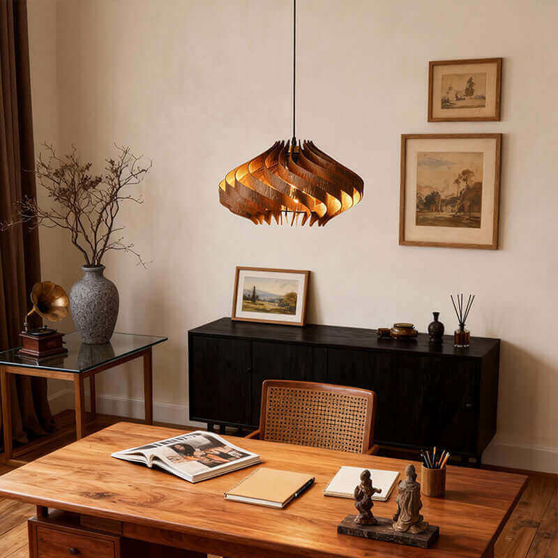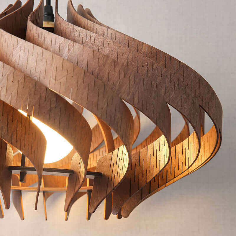 The Savine Pendant Lamp captures the beauty of Japanese-inspired craftsmanship with a modern twist. Crafted from premium basswood, its elegant spiral design diffuses light in soft, rhythmic patterns. Perfect for dining rooms, its natural warmth and sculptural form elevate any contemporary space.