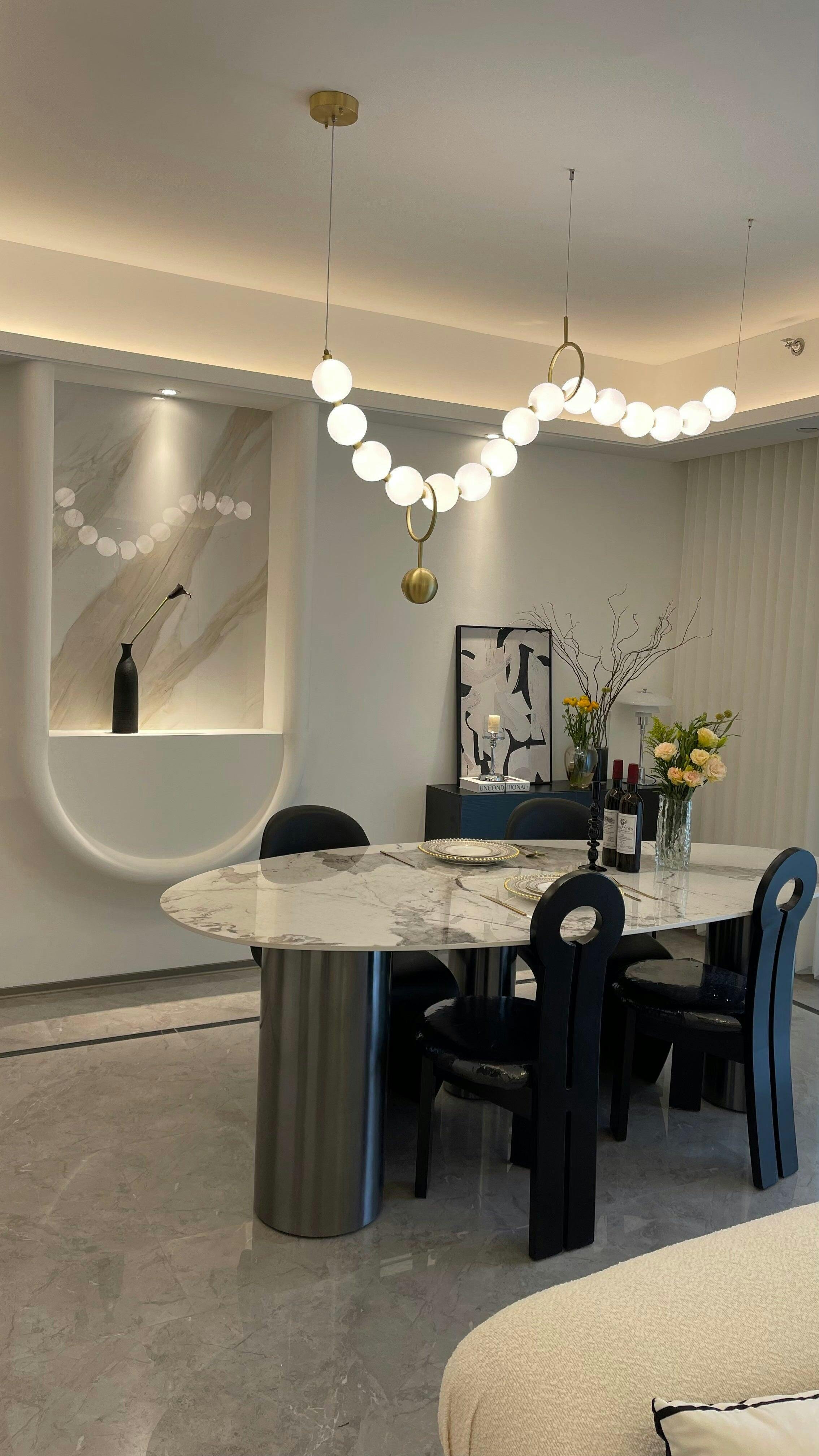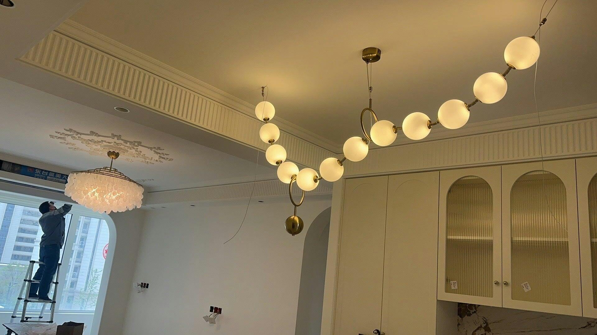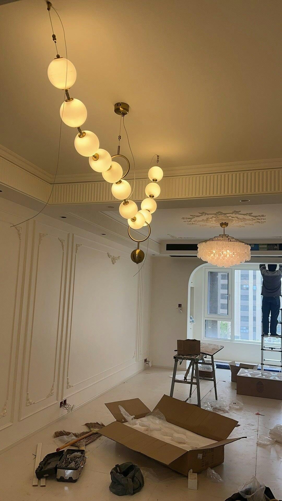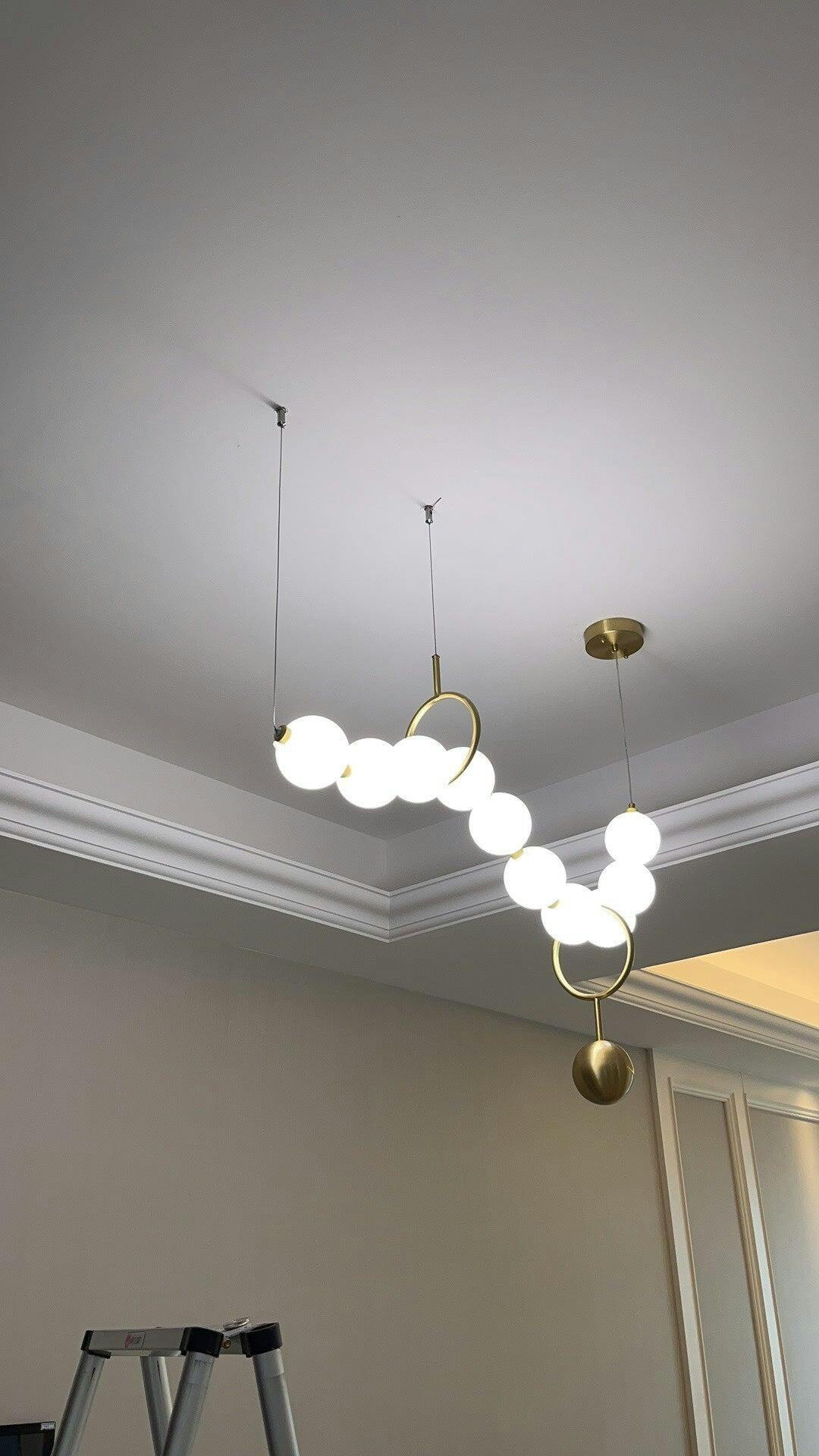 The Necklace Pearl Chandelier is a stunning fusion of jewelry and light. Featuring 10 Acrylic globes that resemble pearls, it adds a touch of elegance to any space. With its adjustable configurations, counterweight, and hook, it fits perfectly in any room, illuminating your surroundings with timeless beauty.