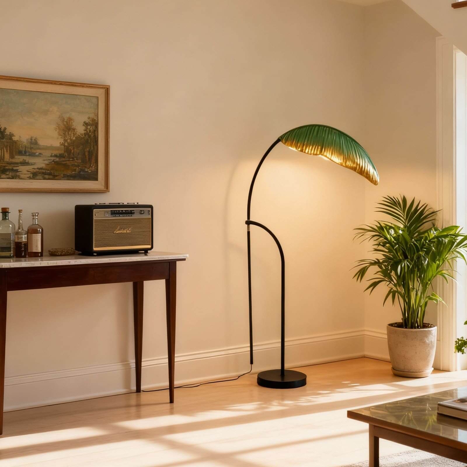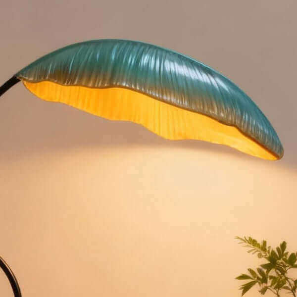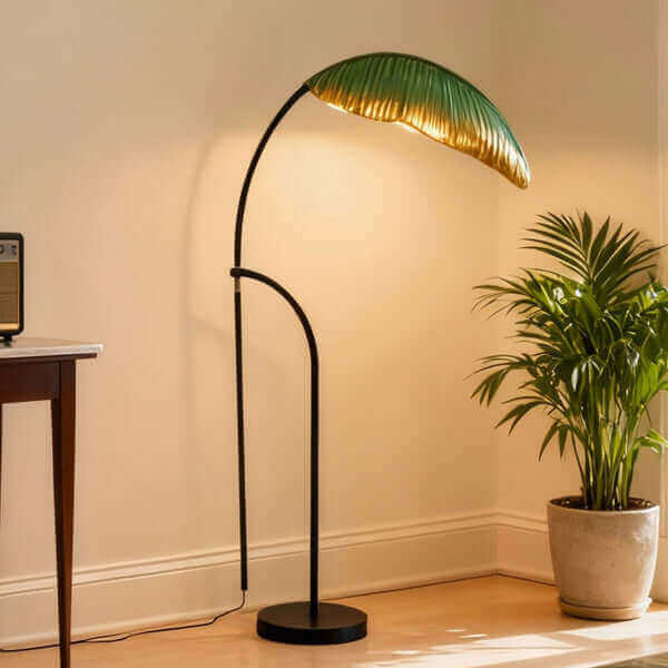 The Veluma Floor Lamp brings nature-inspired elegance into your home. With a sweeping arc and a leaf-shaped shade in forest green and amber, it casts a warm, ambient glow. This modern, adjustable floor lamp is perfect behind sofas or in bedrooms where organic form meets everyday function.
