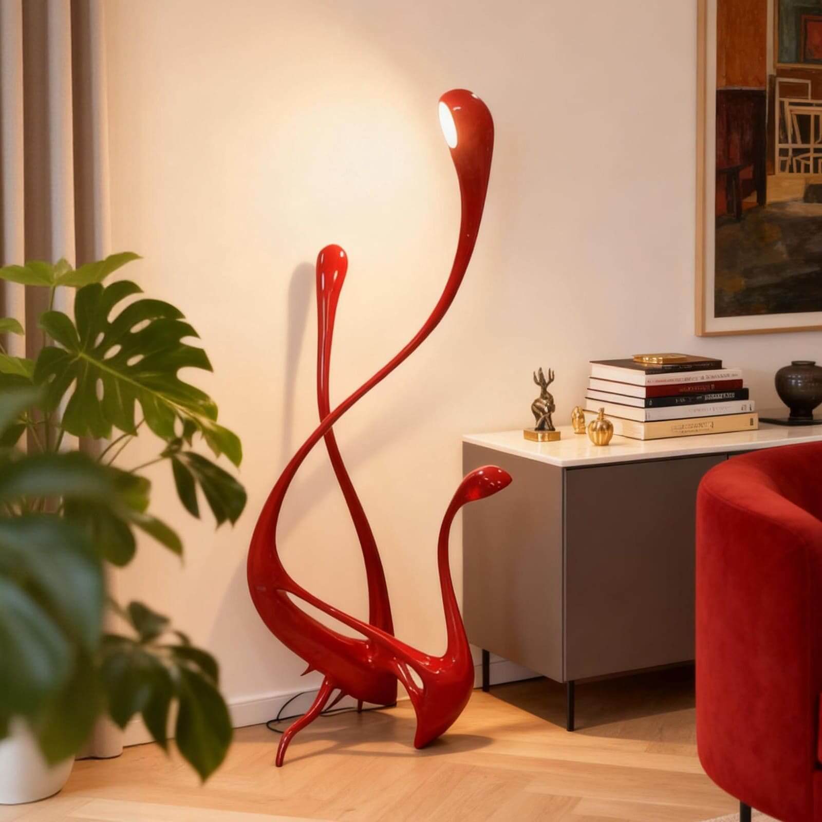 The Yavrixa Sculpture Floor Lamp is a red art deco masterpiece that blurs the line between lighting and modern art. With sweeping curves and a surreal, high-gloss finish, this sculptural designer lamp adds drama, personality, and focused ambient glow to bold interiors and creative spaces.