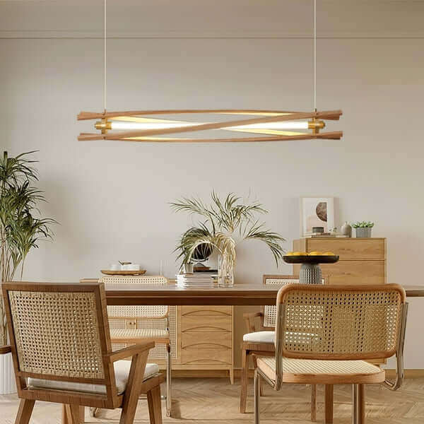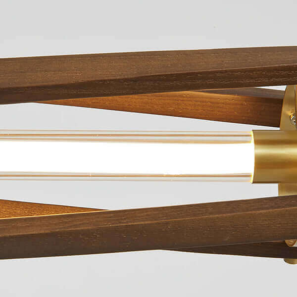The Axis Wood Chandelier combines modern elegance with organic charm. Its unique crisscross wooden design frames brass light fixtures, casting a warm, inviting glow. Perfect for those who love natural beauty with a contemporary touch, this statement piece enhances any space with style and warmth.