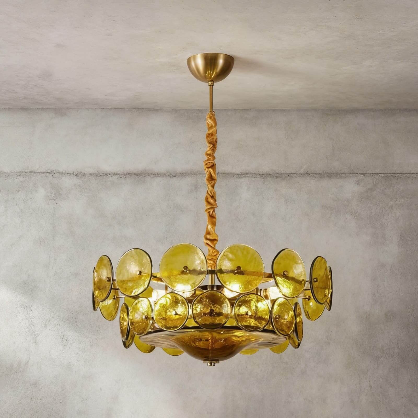 Warm, earthy orange glass discs create a cozy and inviting vintage vibe for any space.