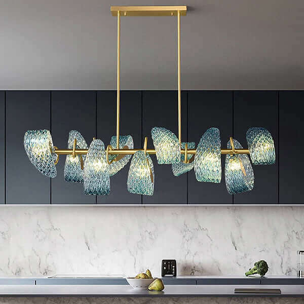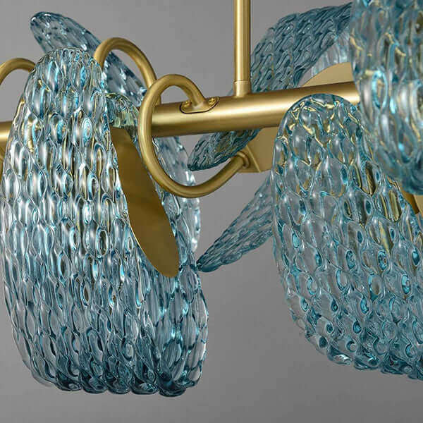 The Petal Blue Chandelier combines elegance and artistry with its all-copper frame and stunning blue glass shades. The unique blue and gold petal design creates a mysterious, noble aura. Handcrafted details enhance its texture, making this chandelier a perfect statement piece for any room.