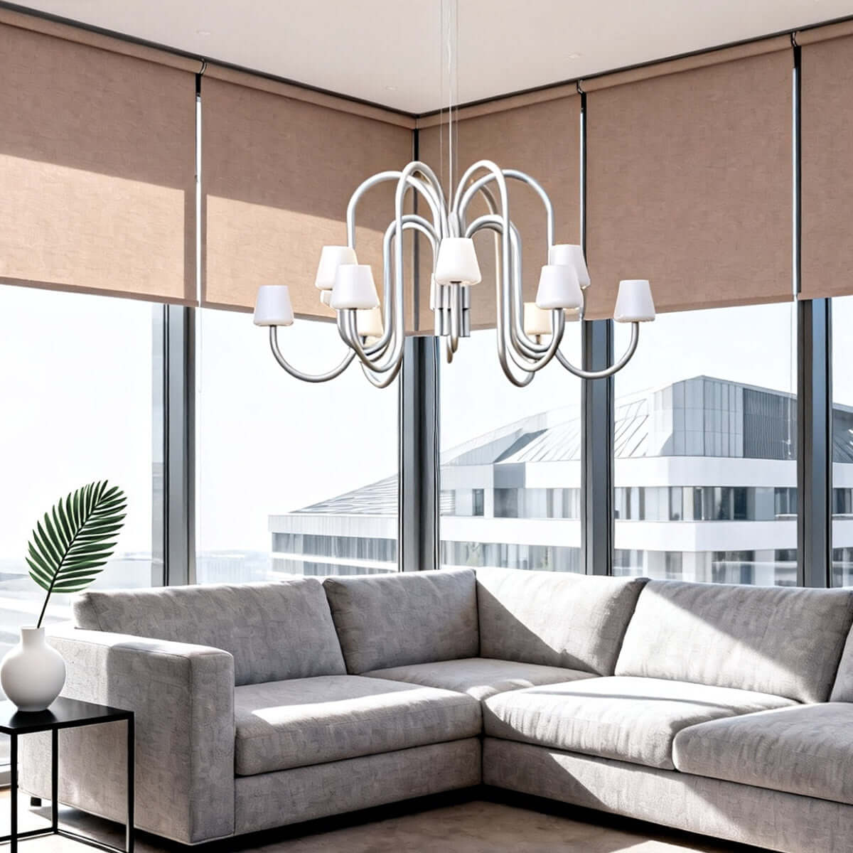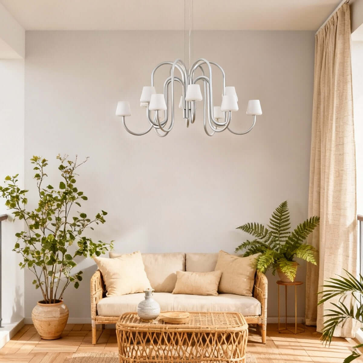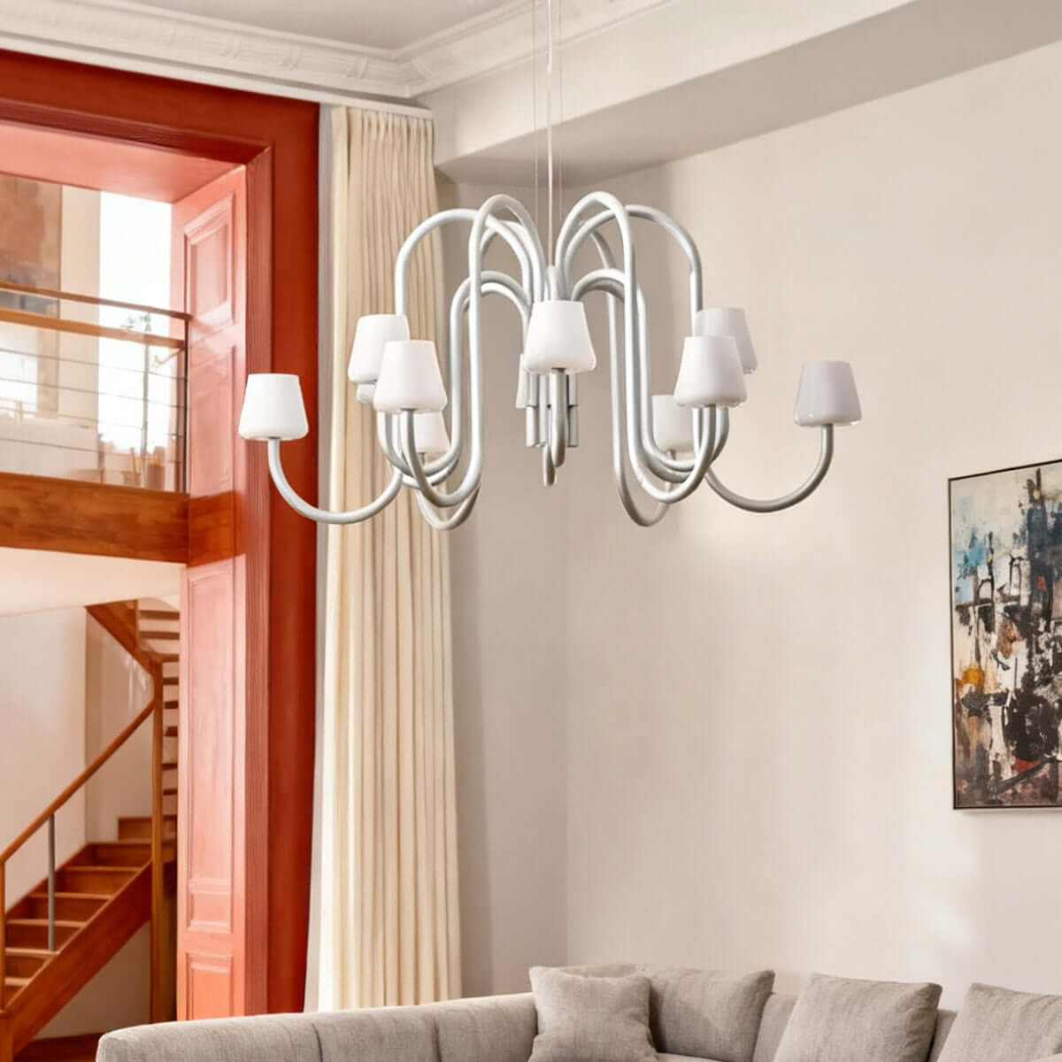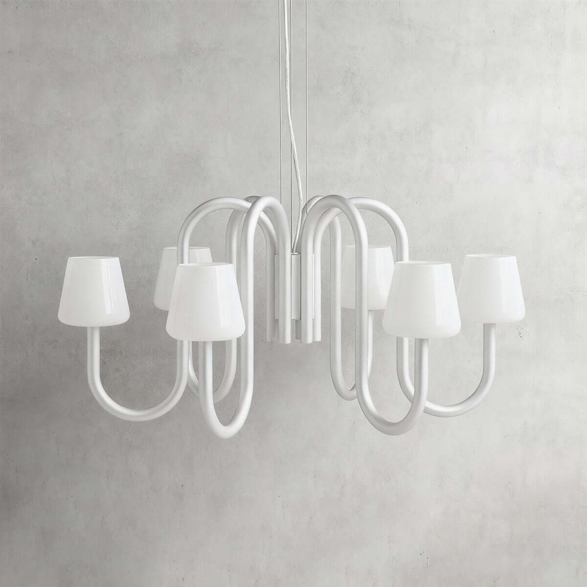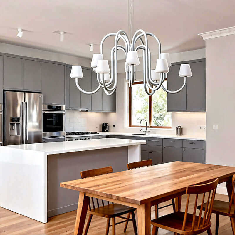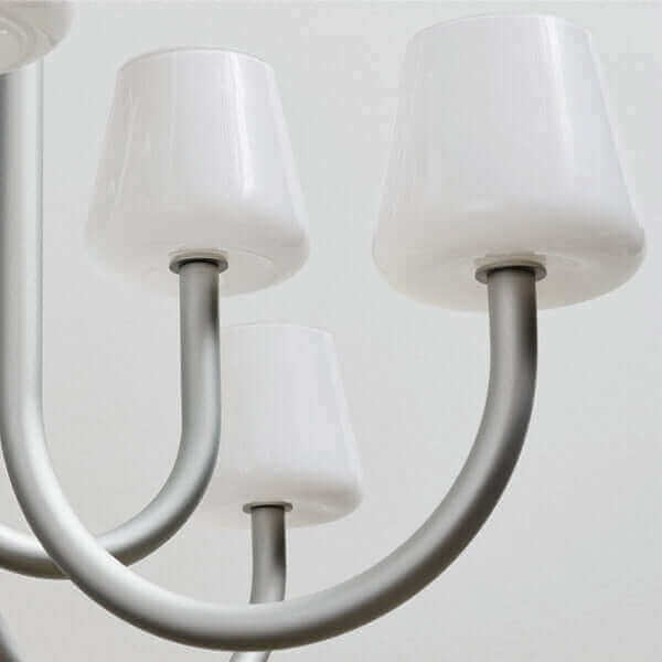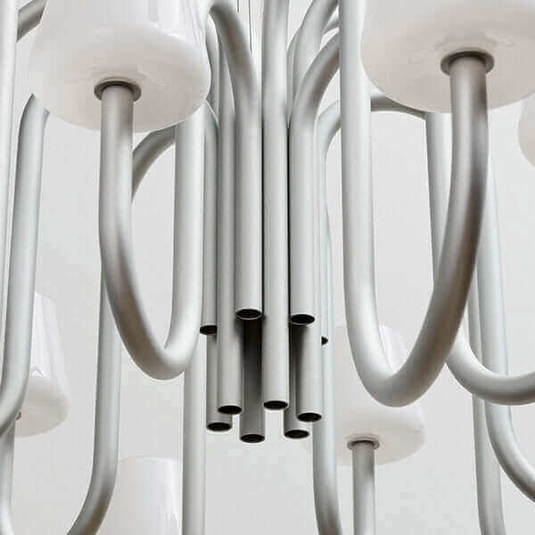 Sculptural yet simple, the Serava Chandelier pairs American minimalist style with understated luxury. Flowing tubular arms in anodized aluminum fall in balanced symmetry, ending in hand-blown glass shades that soften the glow. A monochromatic finish elevates dining rooms or living rooms with playful, modern poise.