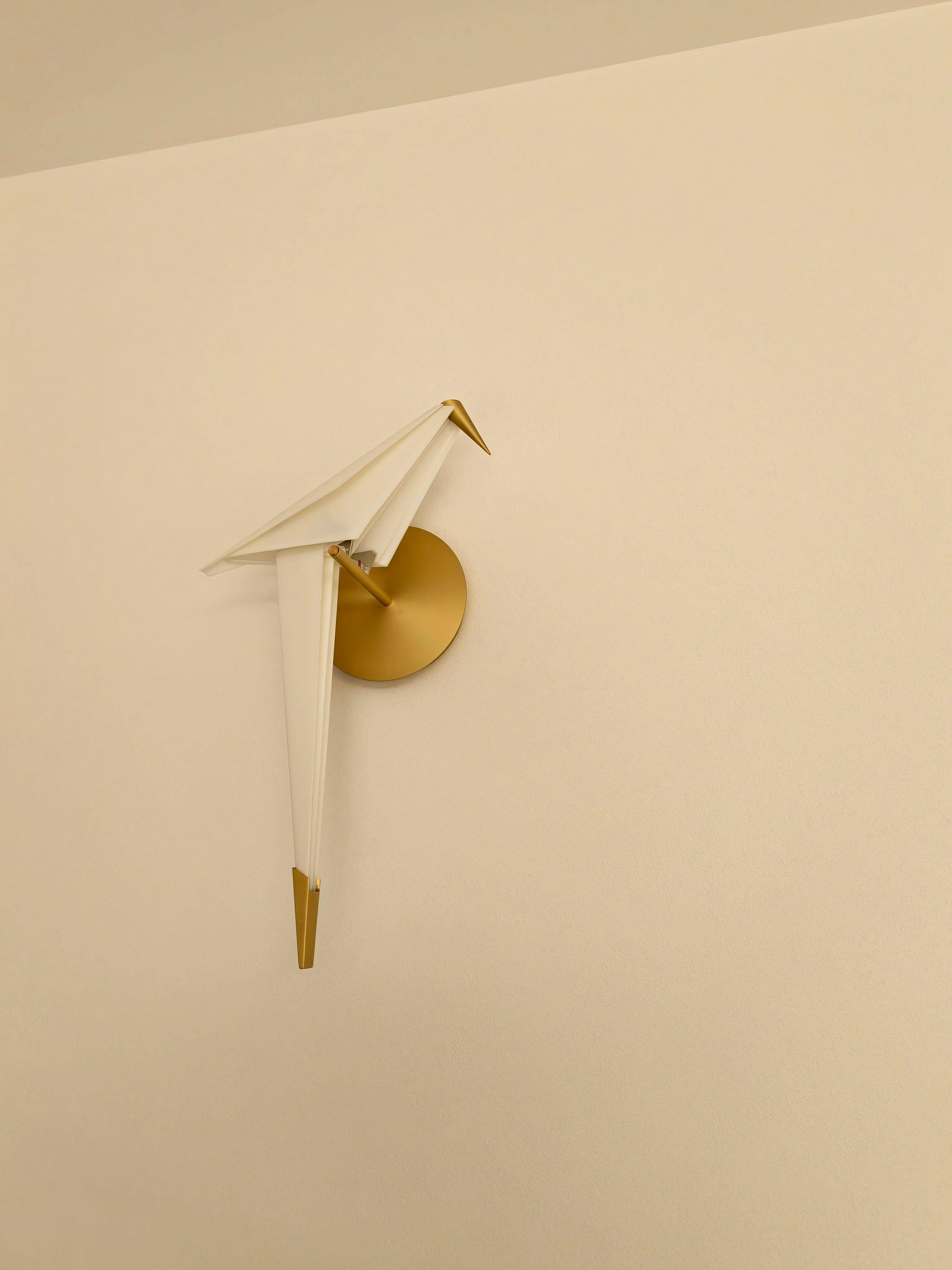 White paper crane wall lamp mounted on a patterned wall, perfect for art deco sconces and farmhouse decor.