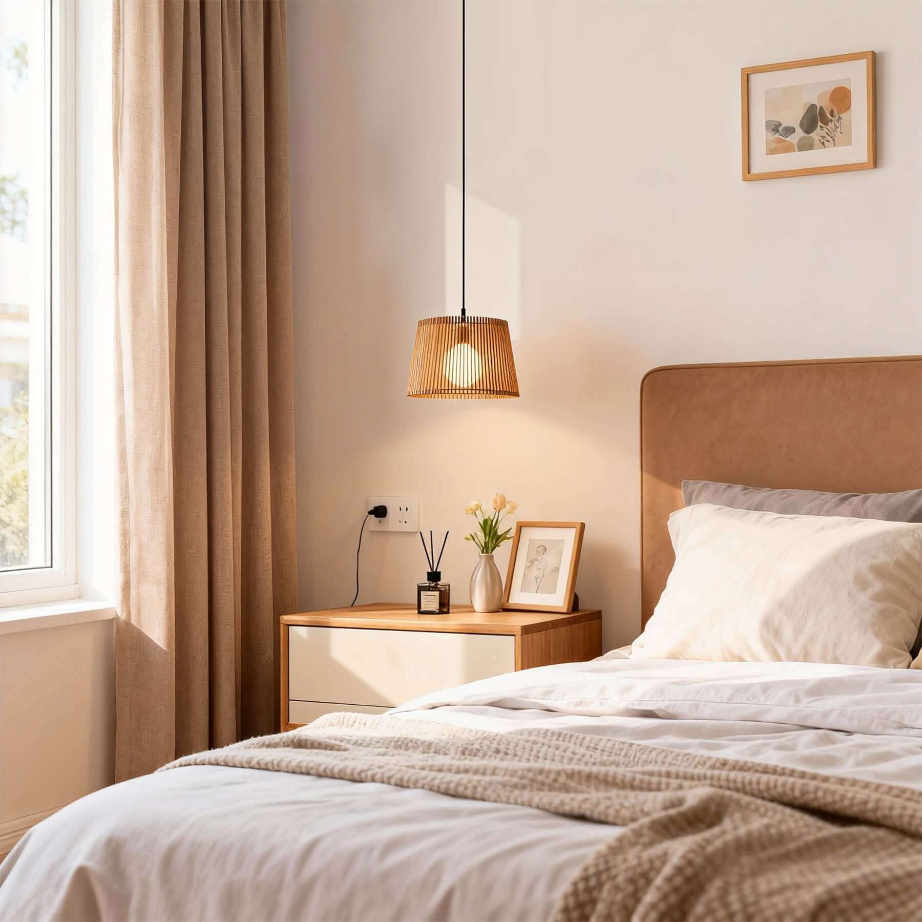 The Lurevo Pendant Lamp brings warmth and charm to any room with its striking wooden slats and bohemian design. Inspired by a bucket shape, this minimalist light creates an enchanting play of light and shadow. Perfect for living rooms, dining rooms, or any space needing a natural, creative touch.