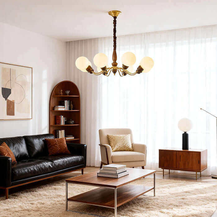 Add timeless elegance to your space with the Movira Chandelier, featuring creamy white spherical glass shades and a warm French retro design. Ideal for dining rooms, living areas, or lobbies, it casts a soft ambient glow that blends beautifully with wood tones for a cozy, refined atmosphere.