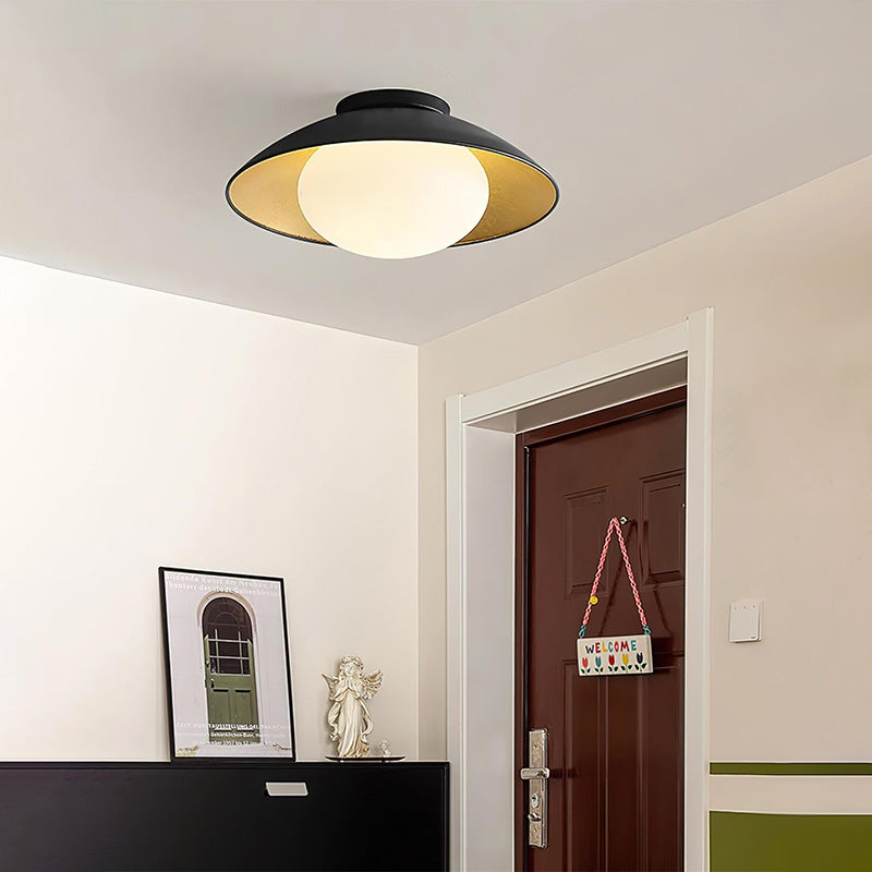 Milky glass diffuses light gently, blending with black metal for comfort, brightness, and versatility.
