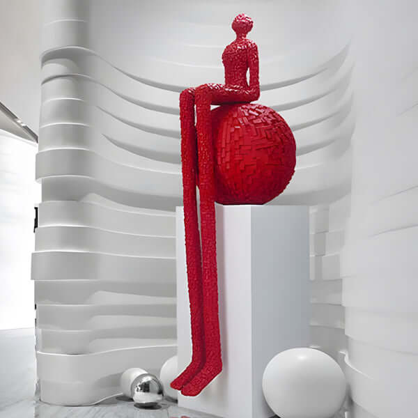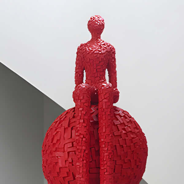 Add bold personality to your space with the Xalino Sculpture—a striking decorative art piece crafted from geometric red blocks. This seated abstract figure rests atop a matching textured sphere, blending color, form, and calm. Ideal as a living room decorative sculpture or statement accent in modern luxury interiors.