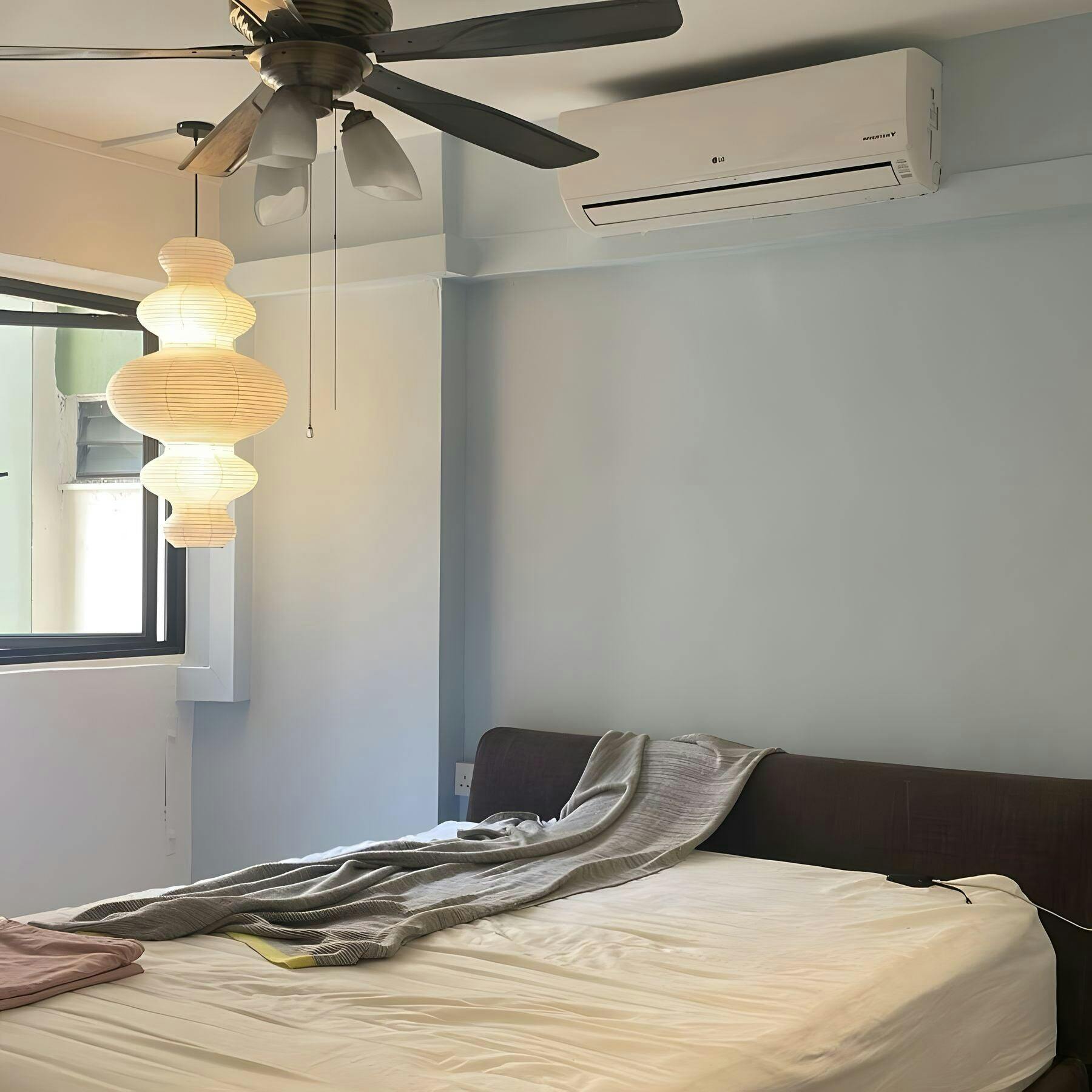 The washi paper shade diffuses light gently, creating a cozy, calming atmosphere.