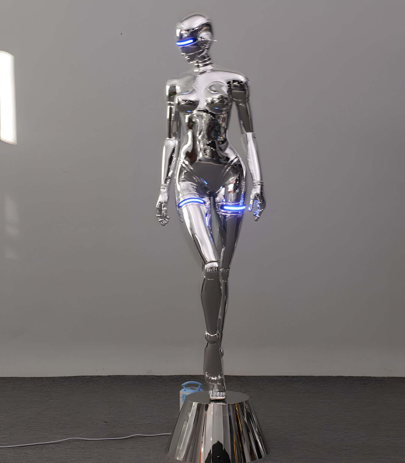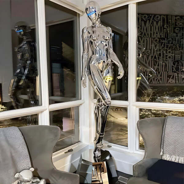 Sleek sculptural robot figure with metallic finish, standing near glass wall in modern interior space.